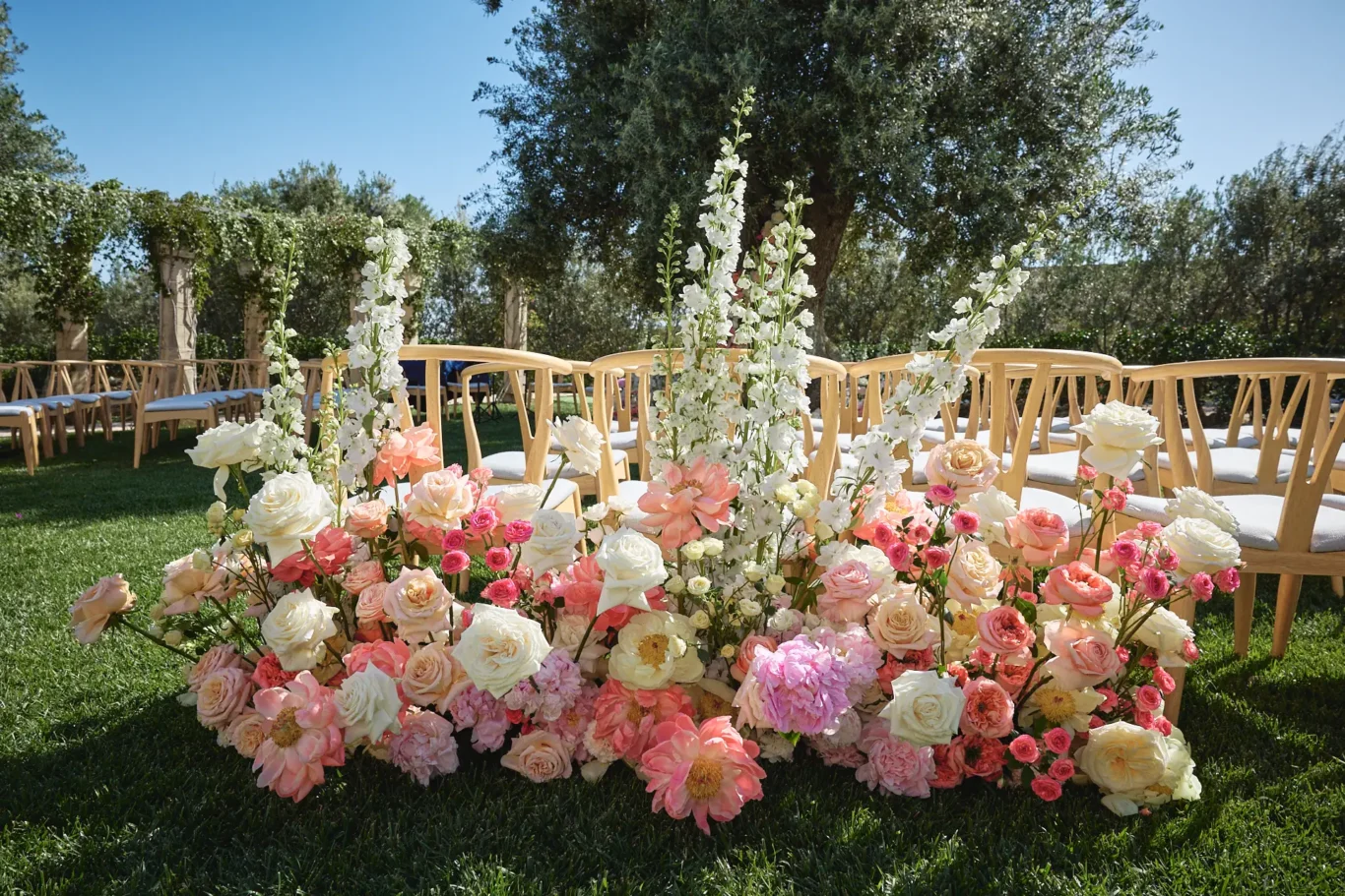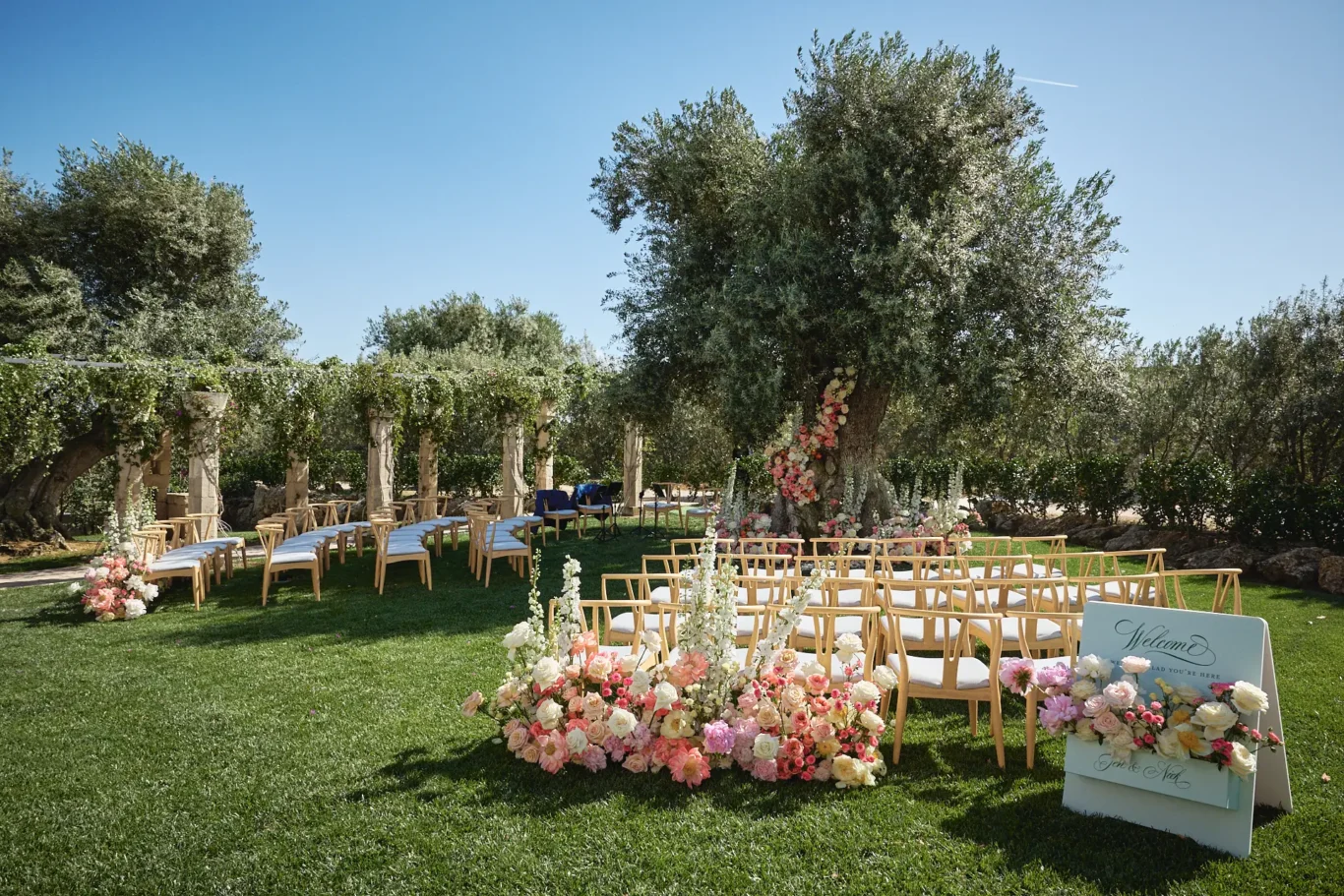 As guests arrived, they were greeted not just by the beauty of the estate, but by a seamless sense of welcome. The ceremony took place in the villa’s gardens, with a magnificent olive tree serving as the natural altar. Our floral design team adorned its ancient trunk with delicate flowers, creating a focal point that felt both organic and utterly romantic.