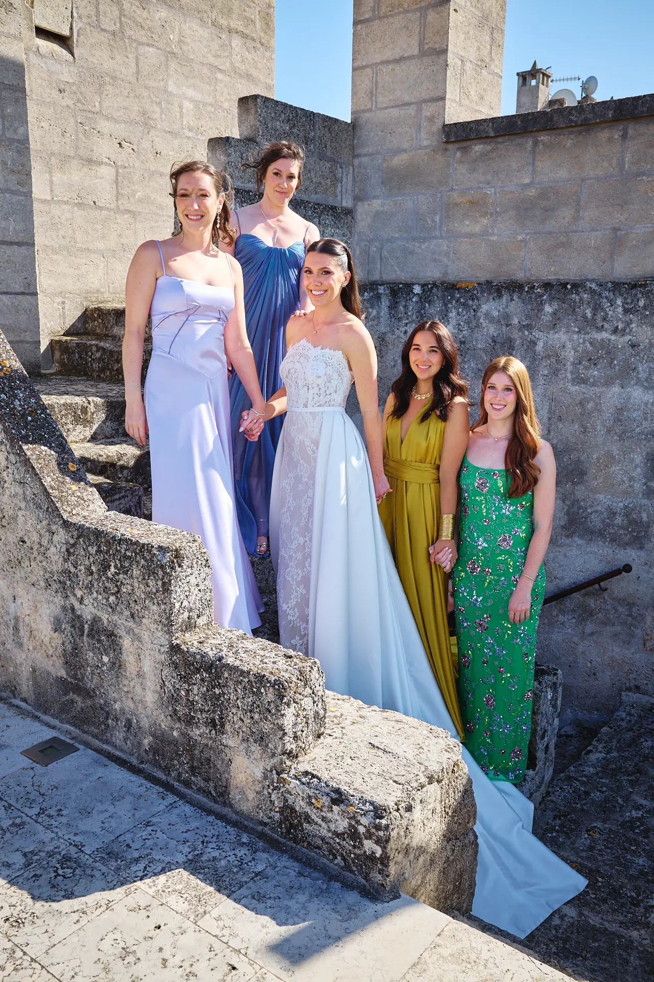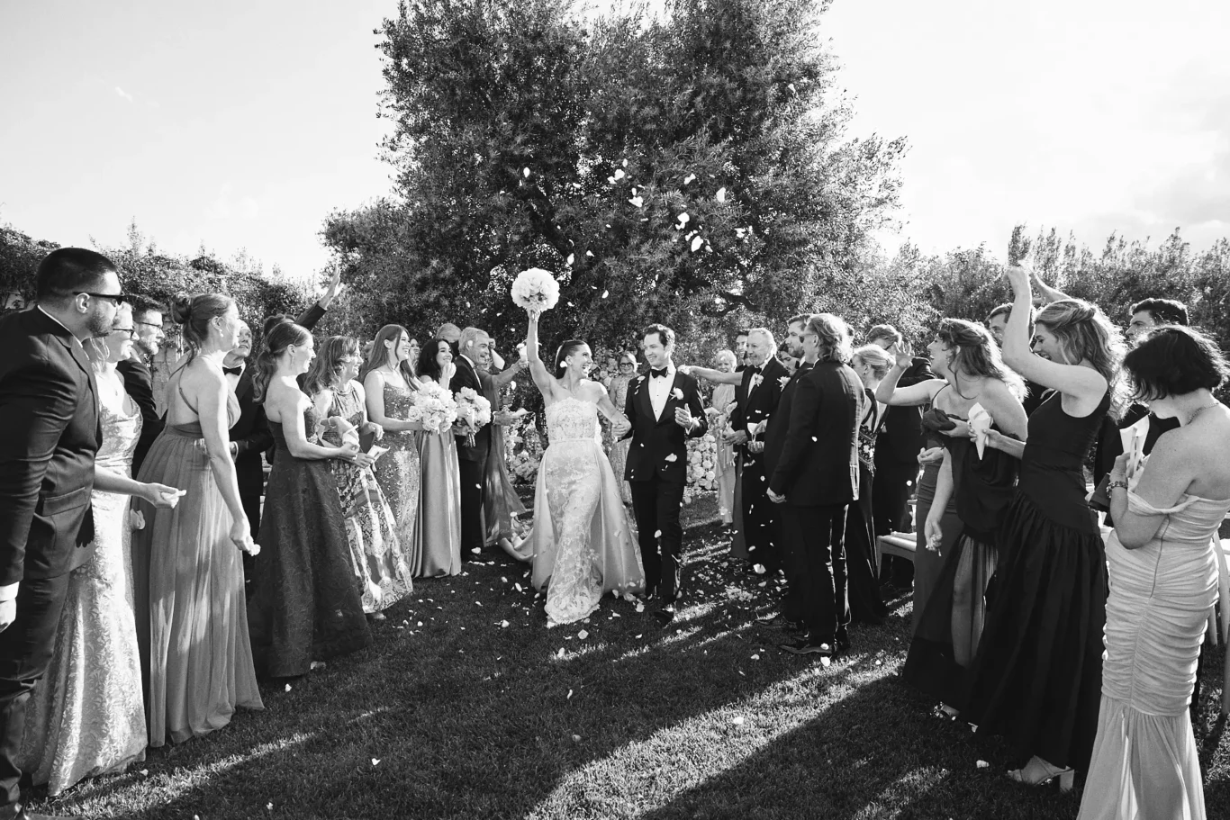 Just before guests were set to arrive, Jen and Nick met for their first look. We guided them to a secluded spot within the estate’s ancient olive groves, creating a private, breathtaking moment just for them. As our co-founder and lead photographer, Jules, often advises, capturing these quiet, unscripted emotions before the day’s energy unfolds is essential to telling the complete story. This was followed by relaxed portraits with their bridal party and immediate family, allowing them to be fully present with their guests after the ceremony.