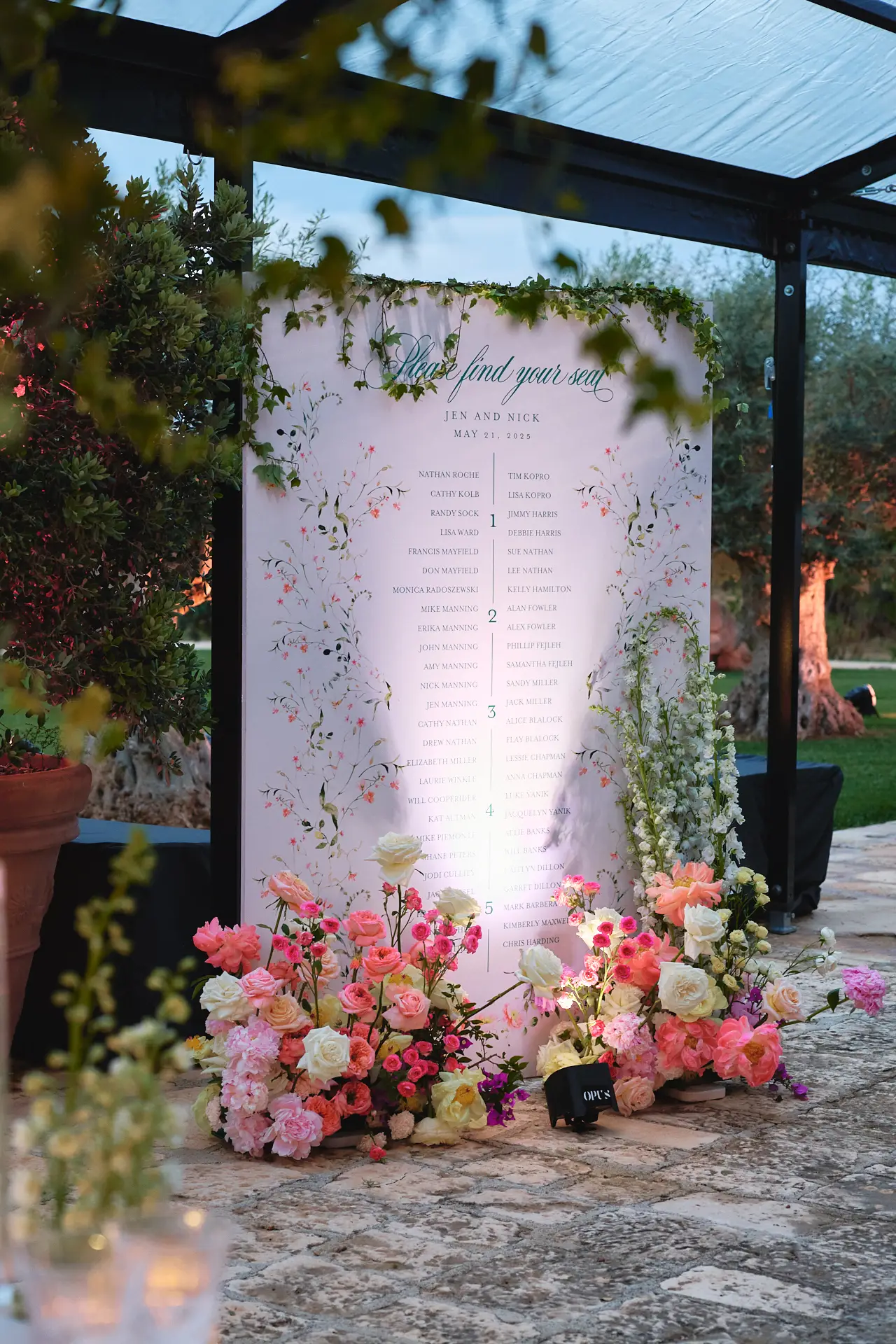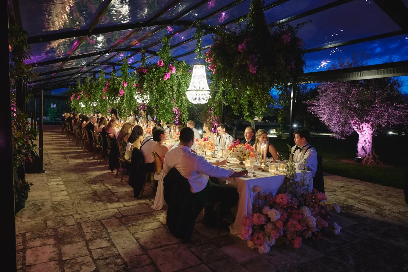 After sunset, we revealed the evening’s main event: a breathtaking imperial dining table on the villa’s rear paved area. To ensure a flawless experience regardless of the weather, we had a custom structure built, from which we hung lush greenery and layers of romantic lighting. The effect was an enchanting, open-air dining room under the stars. The tablescape was a study in refined elegance, creating an intimate setting for a series of funny, heartfelt, and emotional speeches.