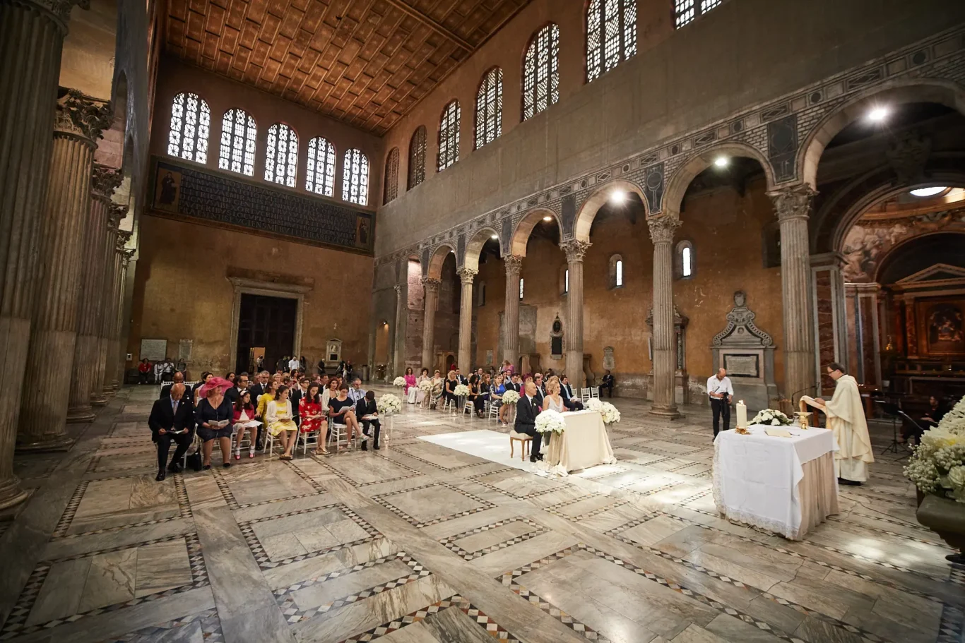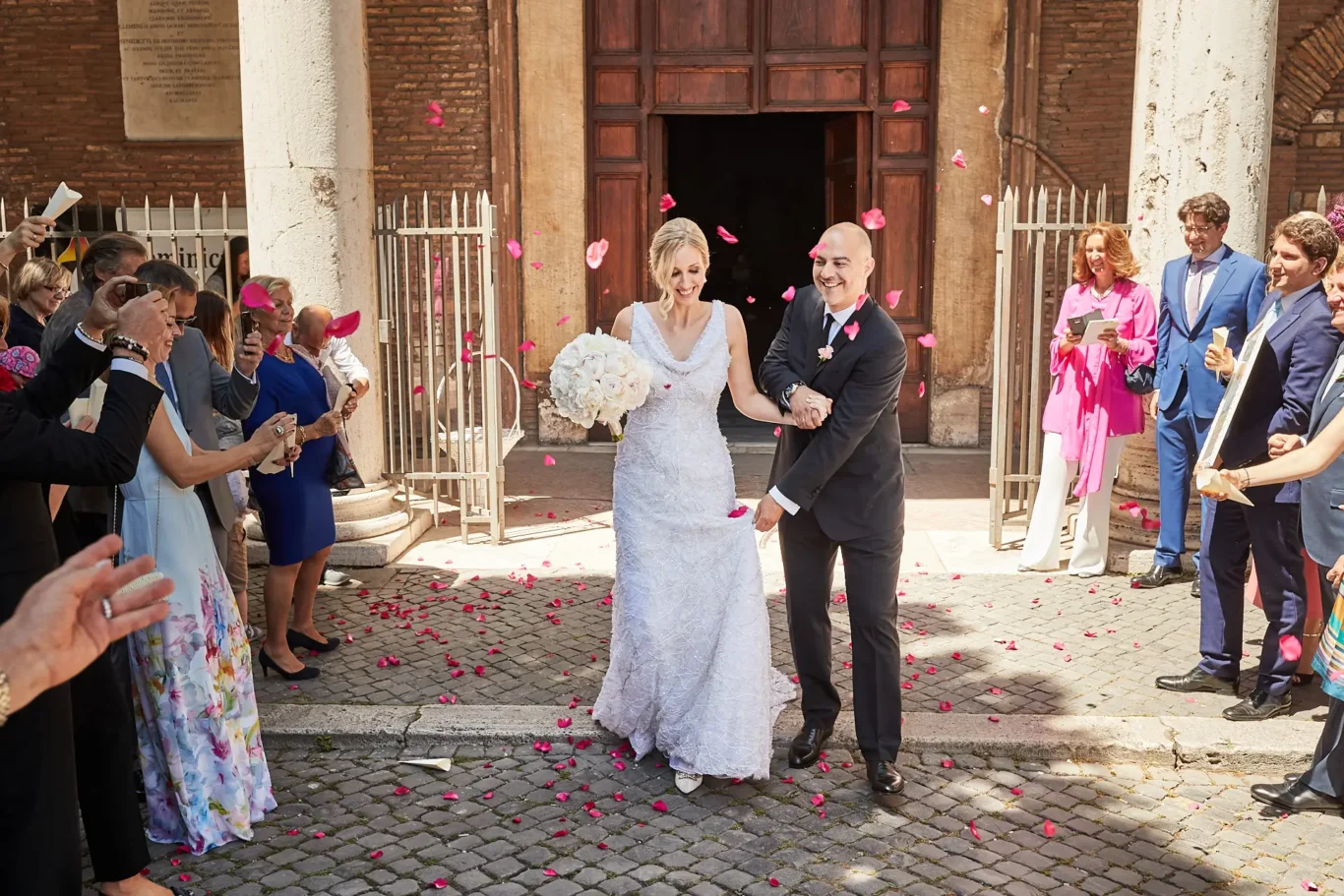 Gintare and Sam’s ceremony was held in one of Rome’s truly stunning churches. The sense of history and reverence within the sacred space provided a profoundly beautiful setting for them to exchange their vows. Our role here is one of invisible execution; managing guest arrivals, coordinating with the clergy, and timing the music perfectly, so that the only thing the couple and their guests experience is the emotion and significance of the moment. Their exit as husband and wife, into the Roman sunshine, was simply unforgettable.