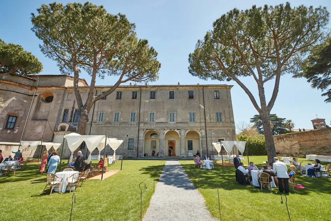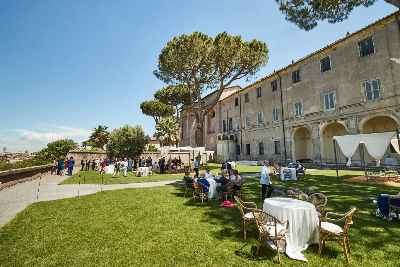 Following the ceremony, guests were transported to the pinnacle of the day: the magnificent Villa Aurelia. Perched atop the Janiculum Hill, the villa offers a breathtaking panorama of the Roman skyline. Here, in the beautiful Italian gardens, the celebration truly began. We created a sophisticated aperitivo hour where guests could mingle and enjoy the view, accompanied by a fantastic live band playing a mix of Latin American and jazz music. It is these moments of transition that are so critical to the guest journey.