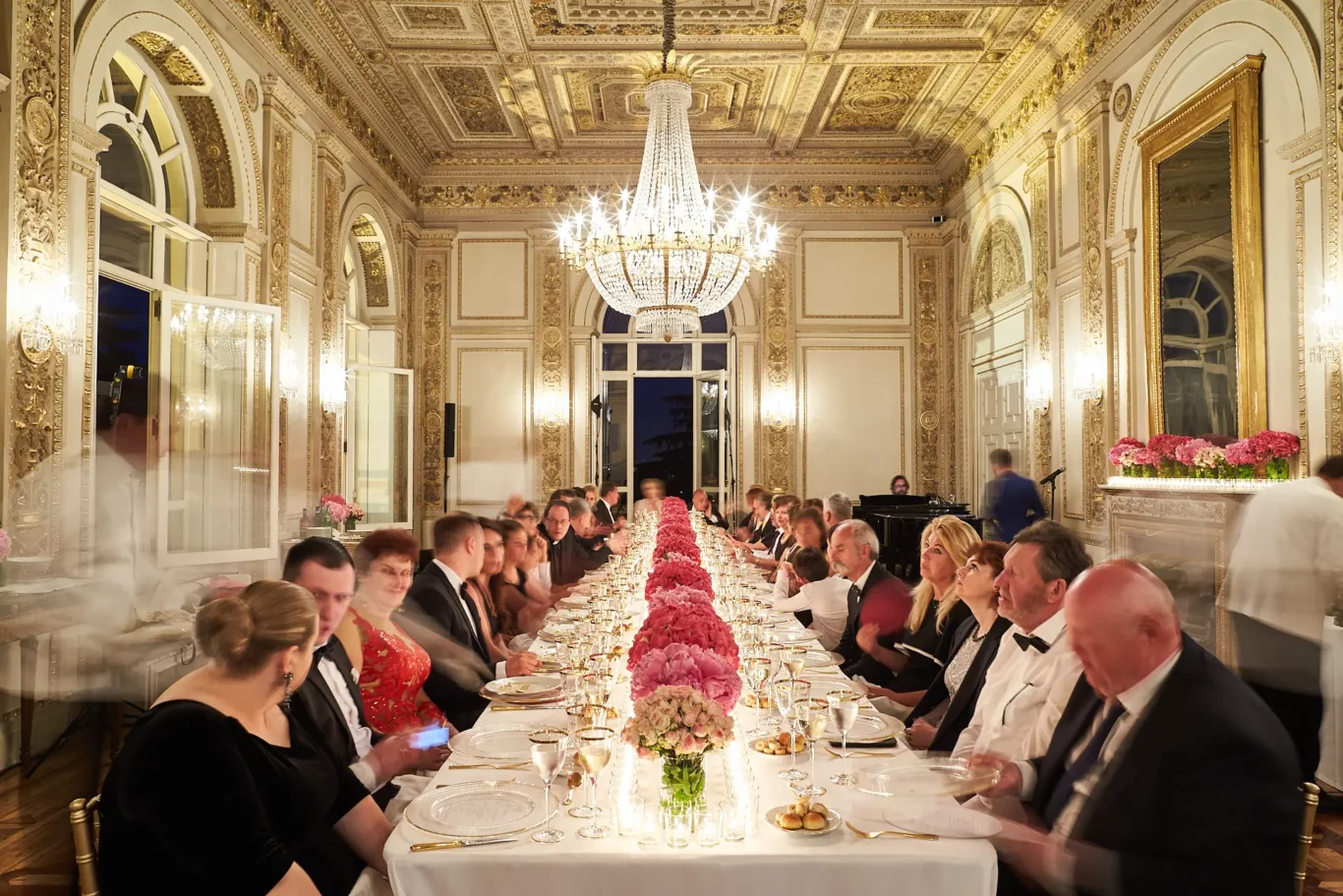 - Dinner set across two magnificent rooms with long, imperial tablescapes.