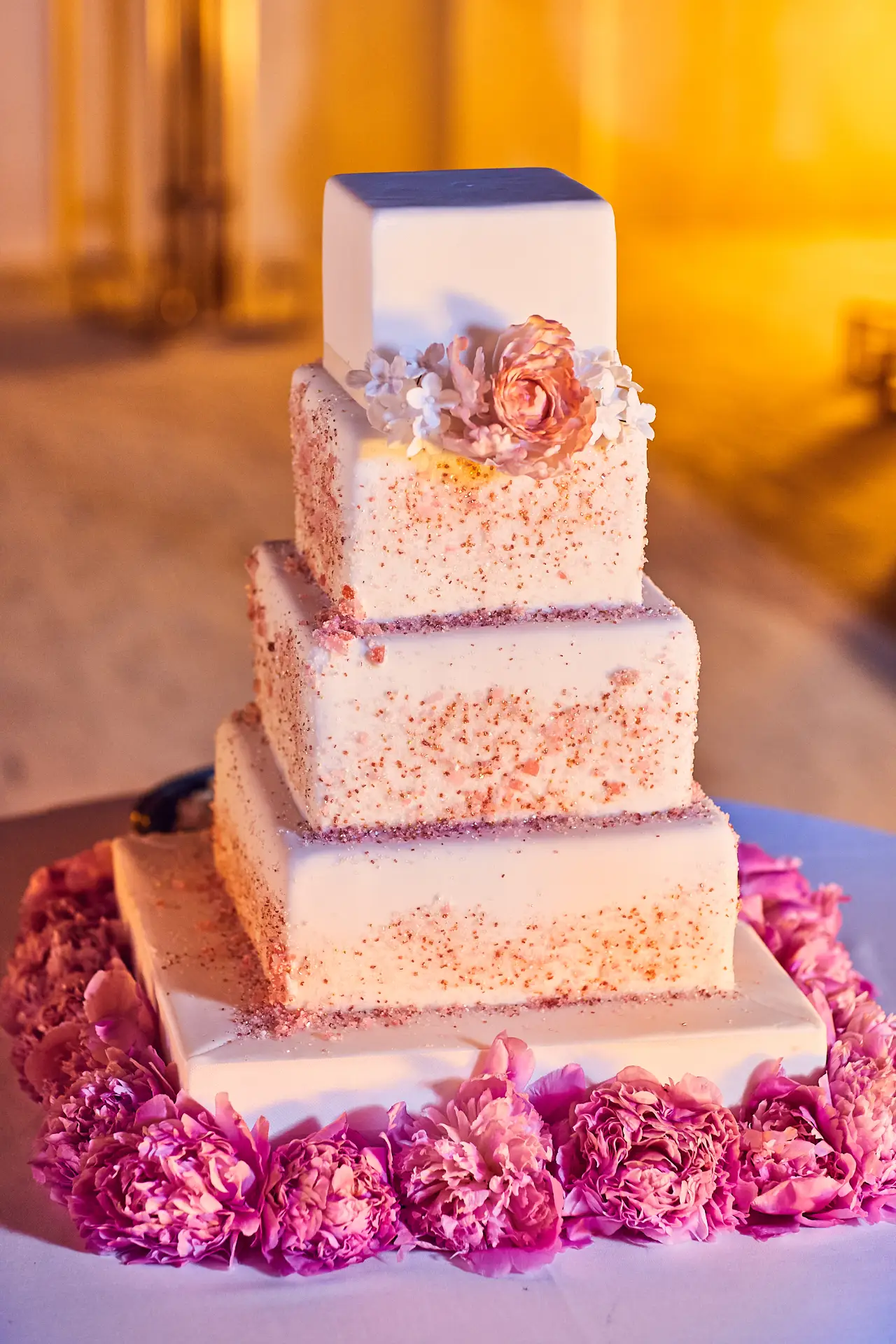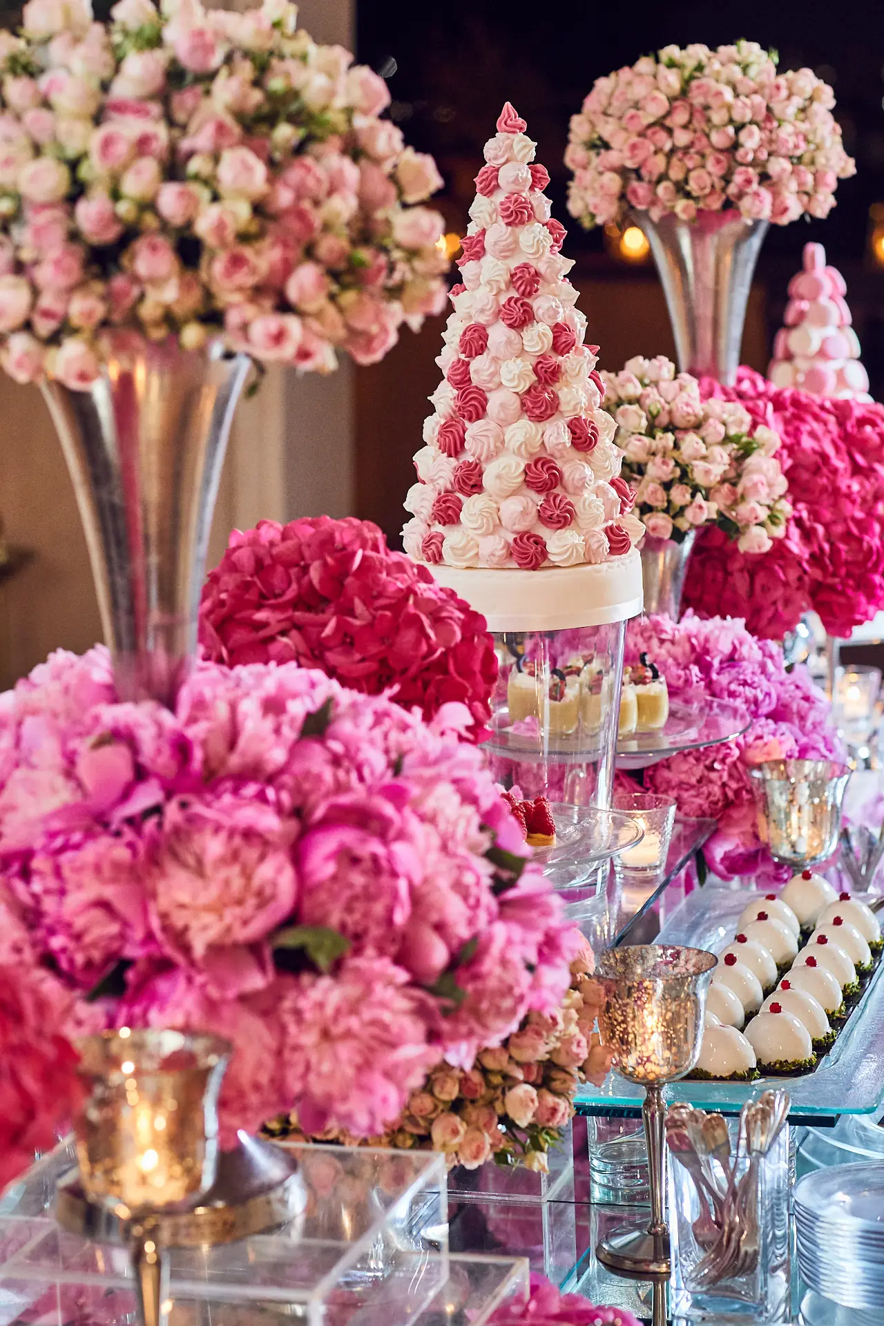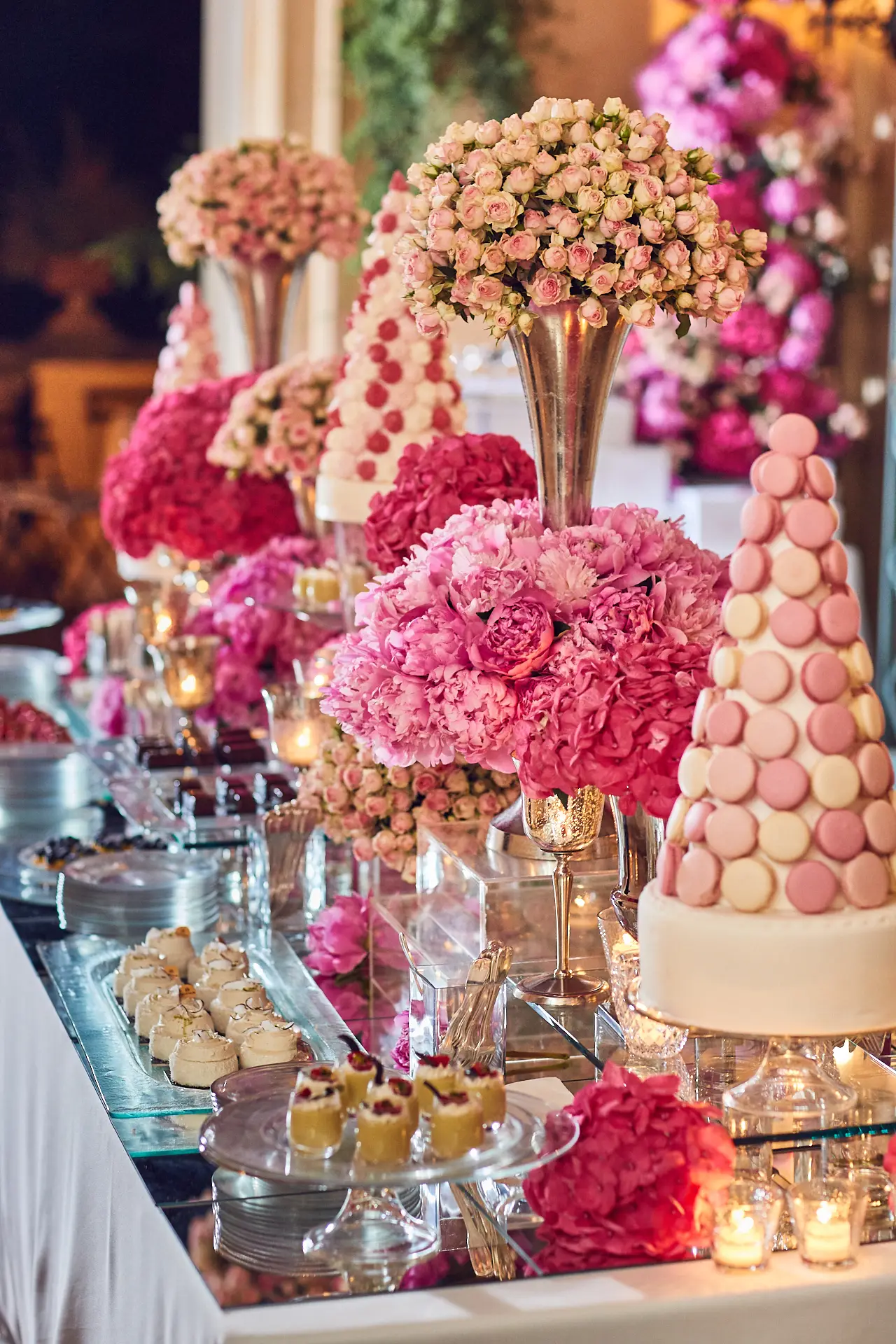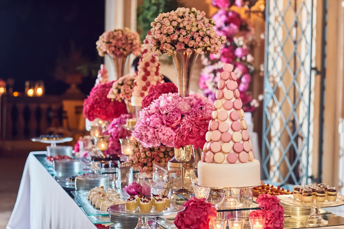 As the sun began to set, we guided guests inside to the beautifully decorated top floor of the villa for a spectacular dinner. To create a feeling of intimacy within the grand space, we designed an elegant tablescape with two long imperial tables, adorned with classic floral arrangements and candlelight. After dinner, the evening flowed downstairs, where a decadent dessert buffet and the wedding cake were revealed. In the main hall, Gintare and Sam shared their first dance, which transitioned from a live music set into a full party with a DJ that carried the celebration late into the Roman night. It was the perfect culmination of a day filled with elegance, joy, and timeless romance.