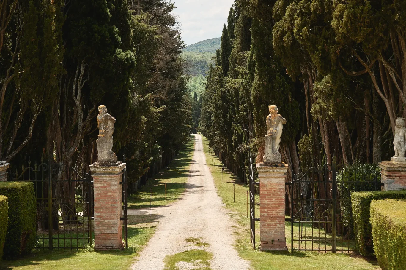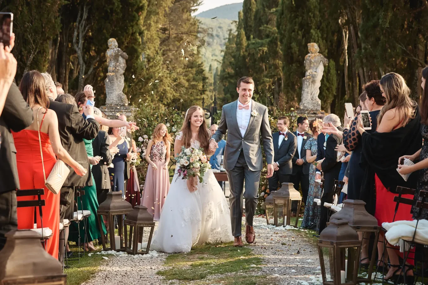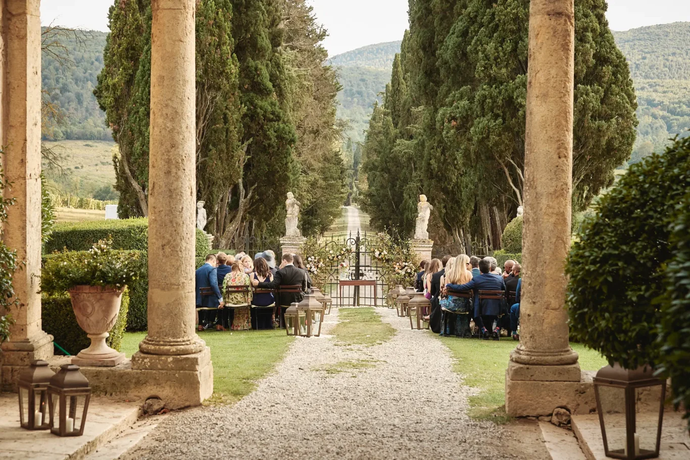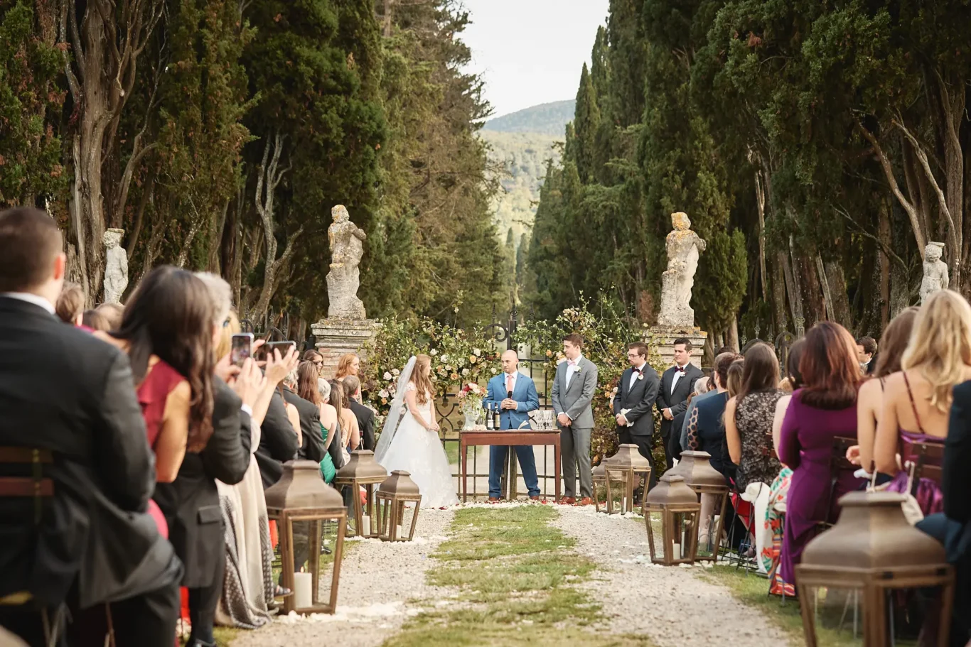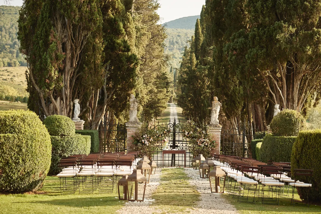 The day began with a ceremony that was quintessentially Tuscan. It was Sabrina’s vision to utilize the magnificent iron gates and the epic scale of the cypress tree-lined driveway as a natural cathedral for our couple. This unique setting, which has since become a cherished location for ceremonies at the Borgo, provided a powerful and dramatic backdrop for Elizabeth and Timothy to exchange their vows. Our planning ensured that every logistical detail was invisible, allowing the couple and their guests to be fully present in the moment.