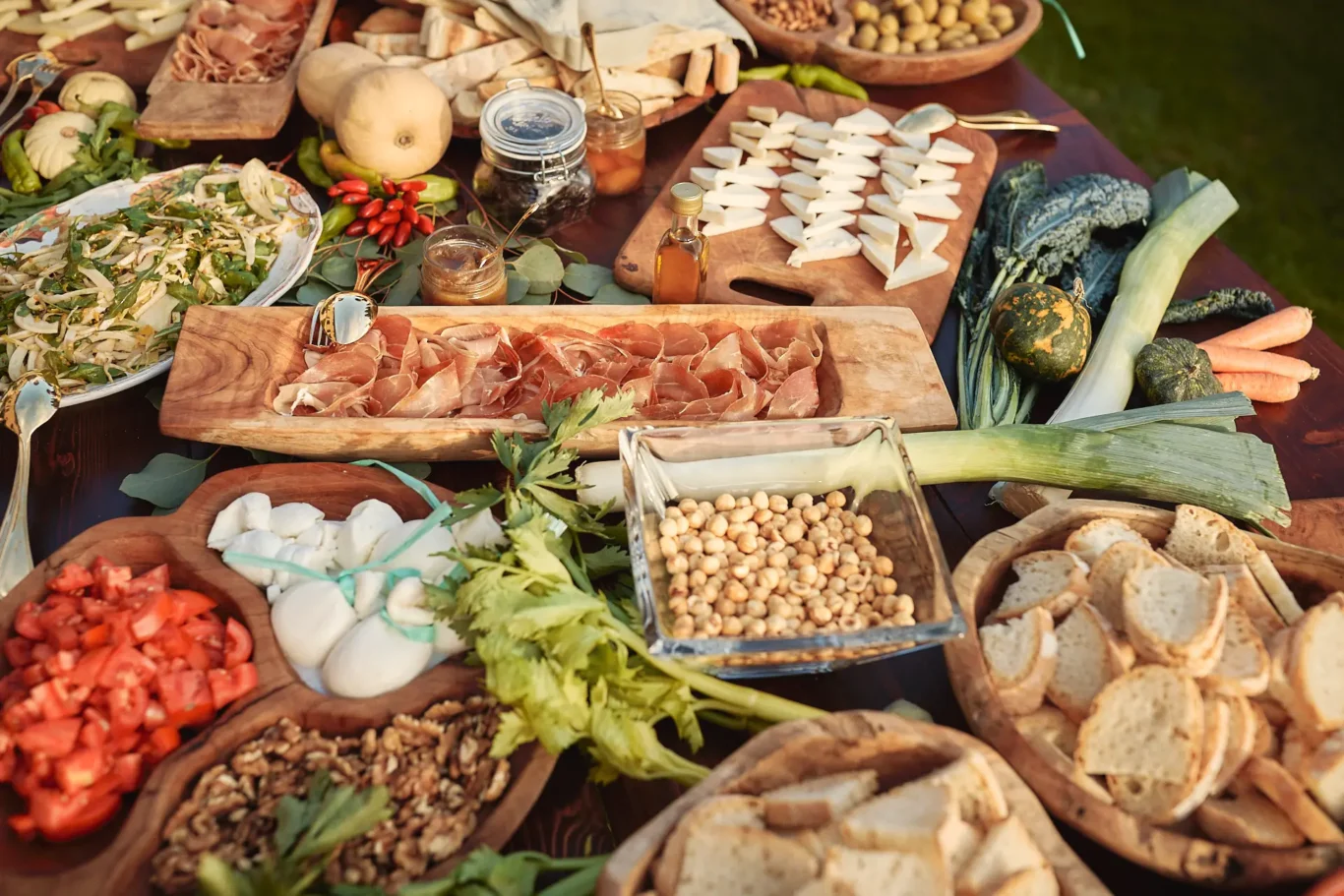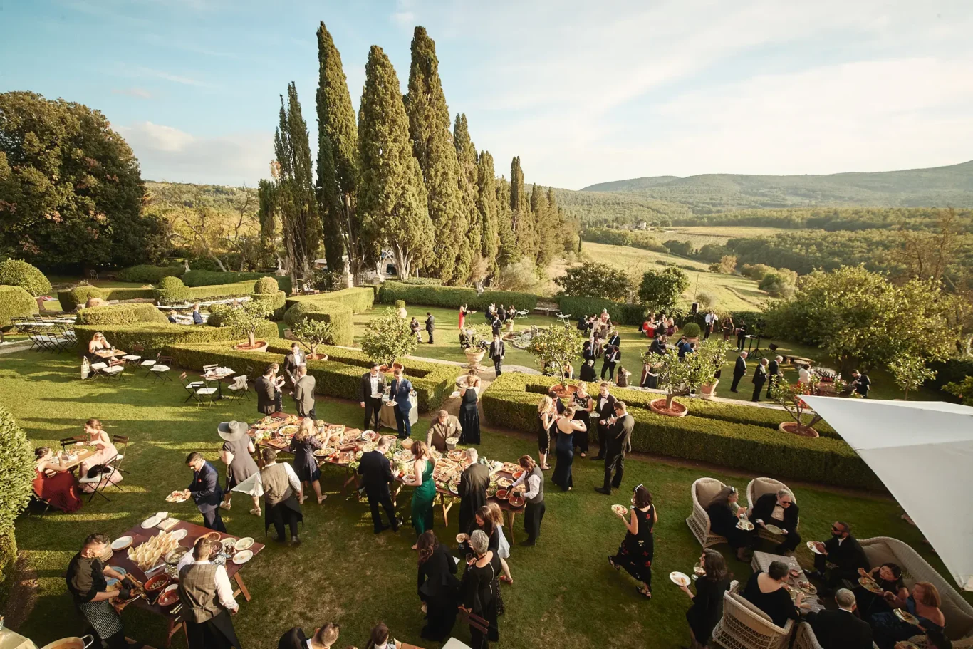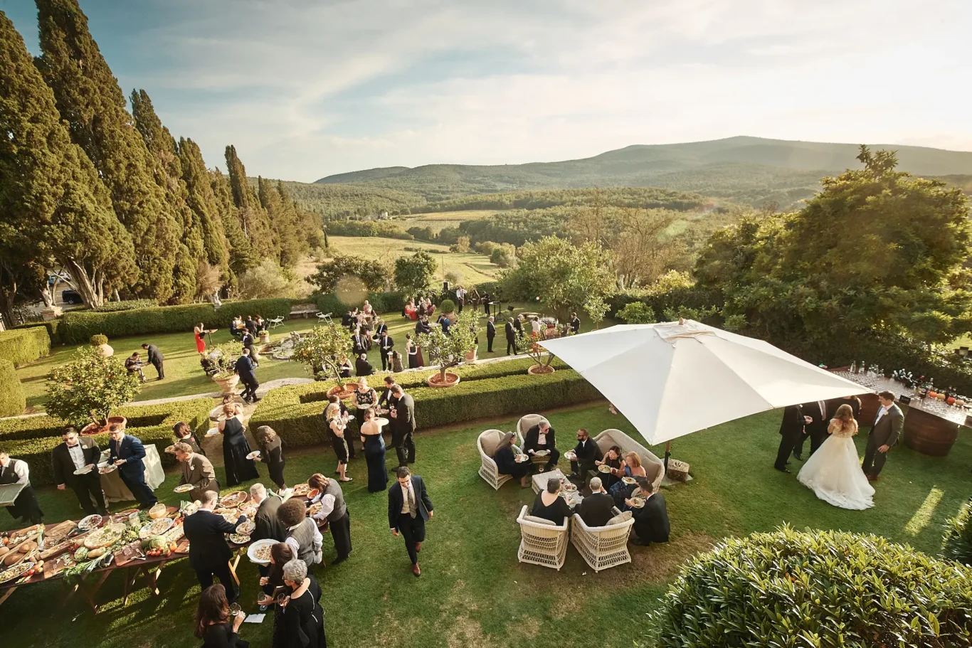 Following the ceremony, guests were guided to the upper lawns for a delightful aperitivo. Here, they were greeted with a delicious selection of Tuscan delicacies and crisp prosecco, allowing them to mingle and congratulate the newlyweds while basking in the afternoon sun. We believe the transition between events is paramount to the guest journey. The flow from the dramatic ceremony to this relaxed, welcoming atmosphere was designed to feel effortless, setting a joyful tone for the rest of the celebration.
