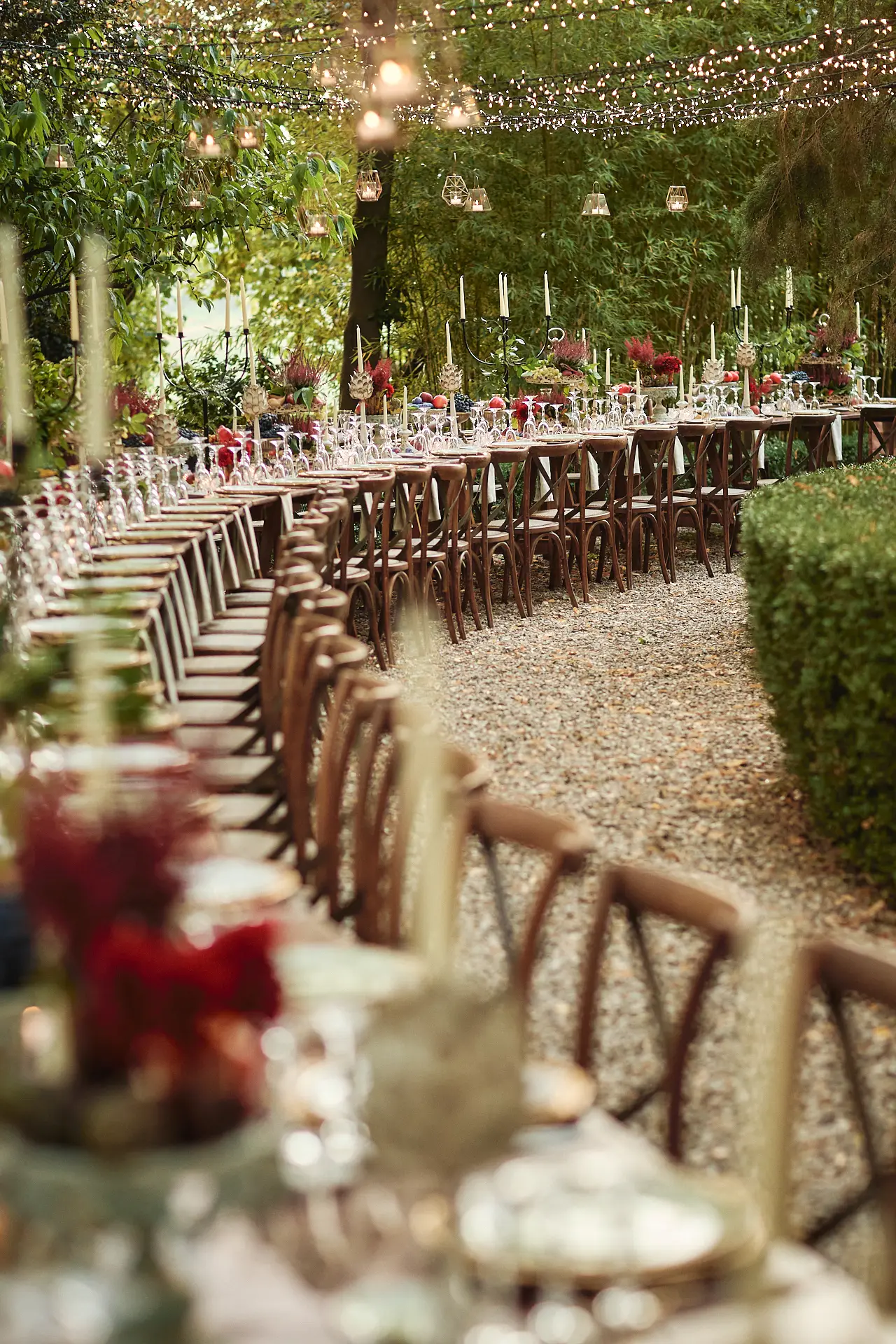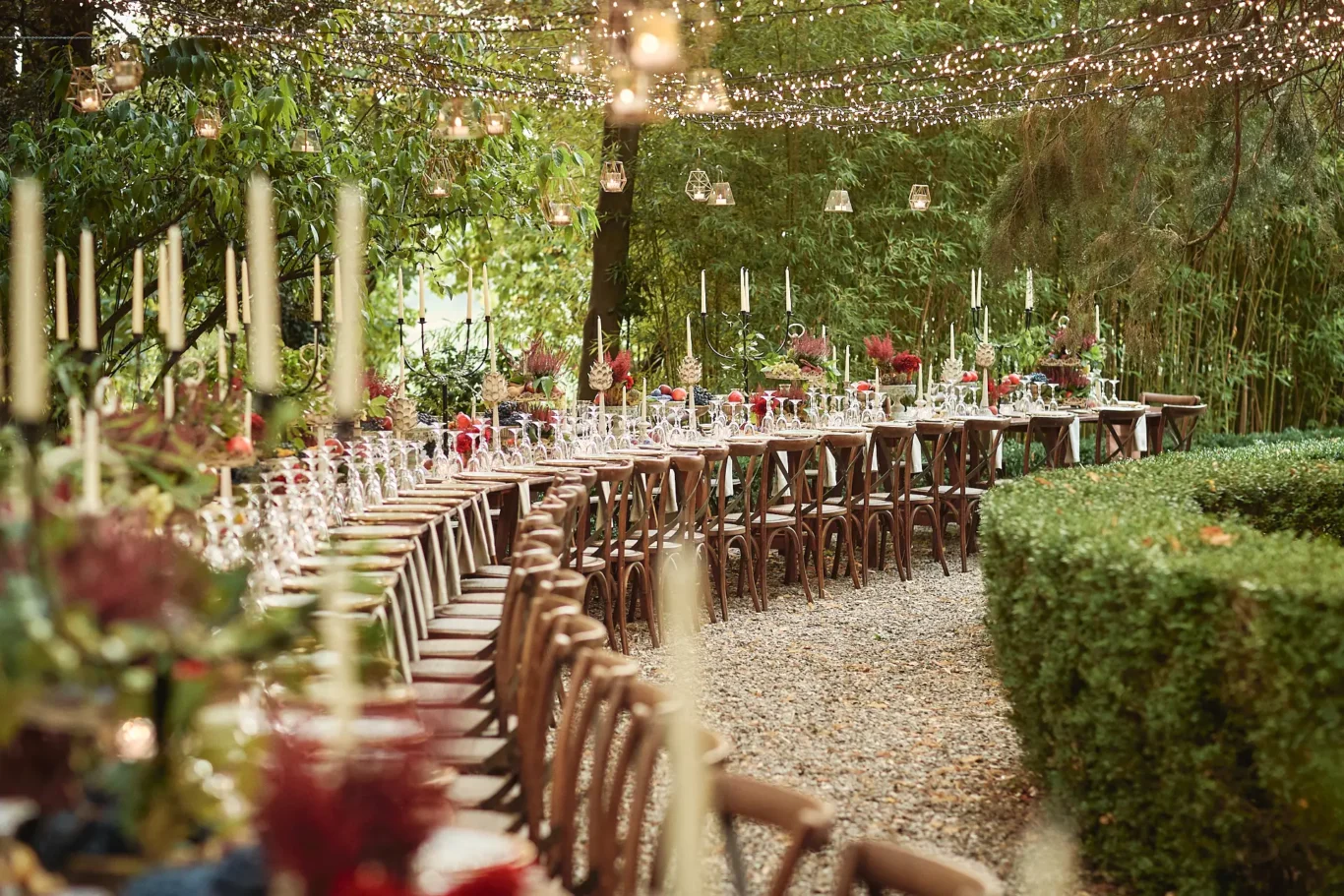- A spectacular, curved al fresco dinner table under the trees, celebrating the romance of an autumn harvest.