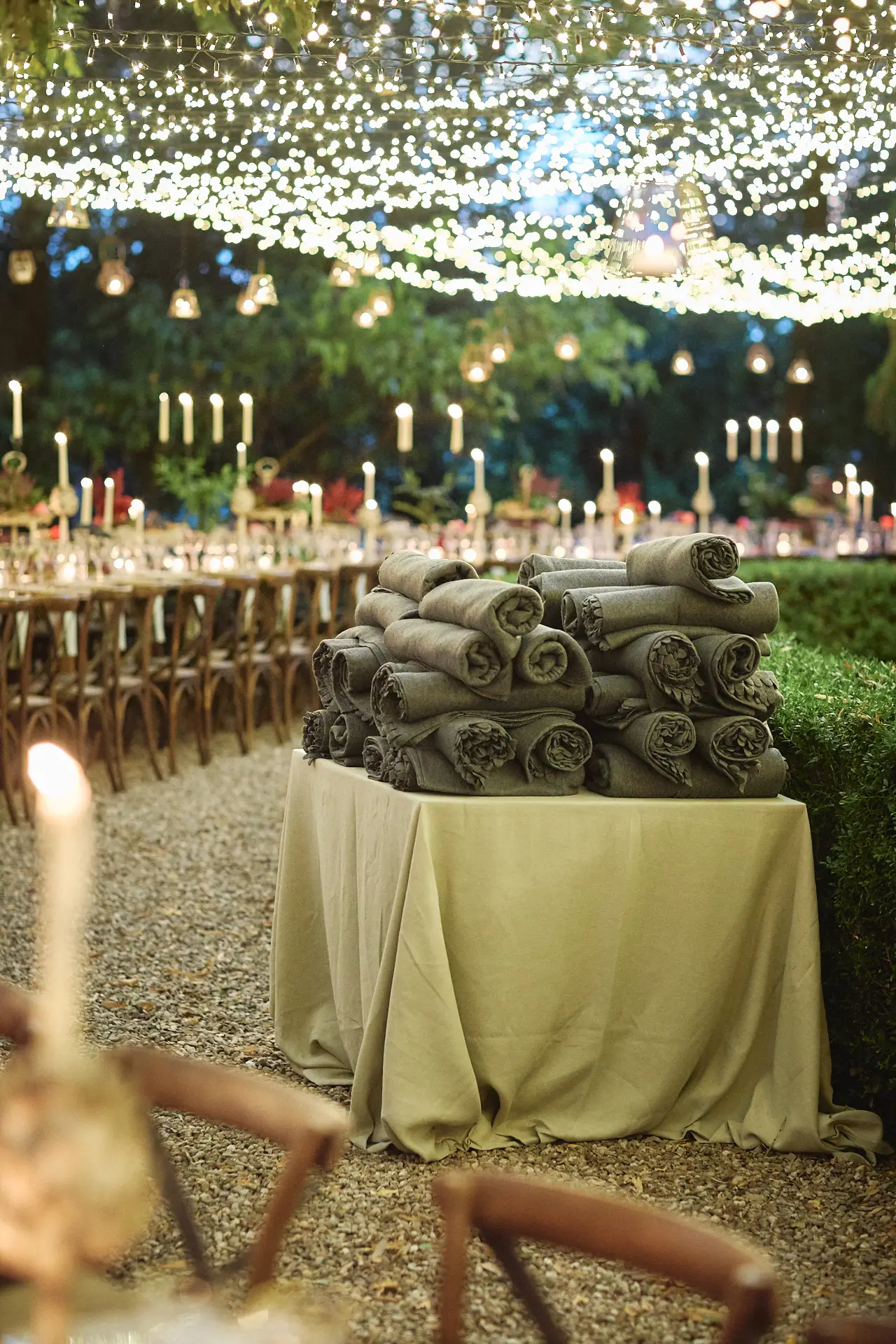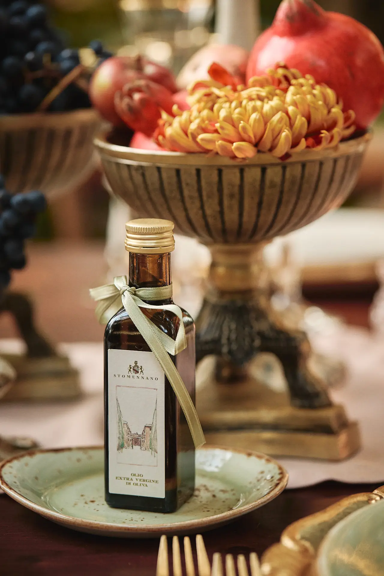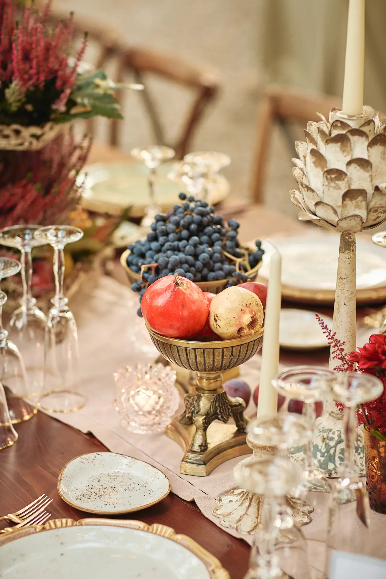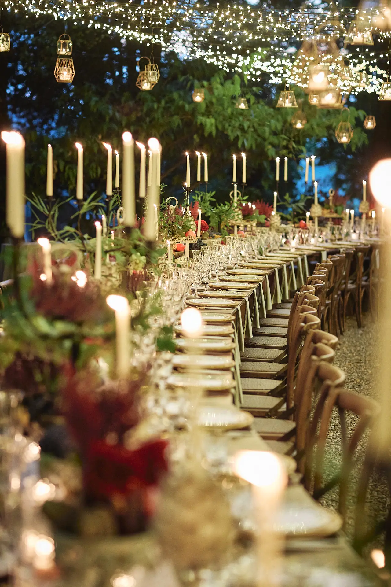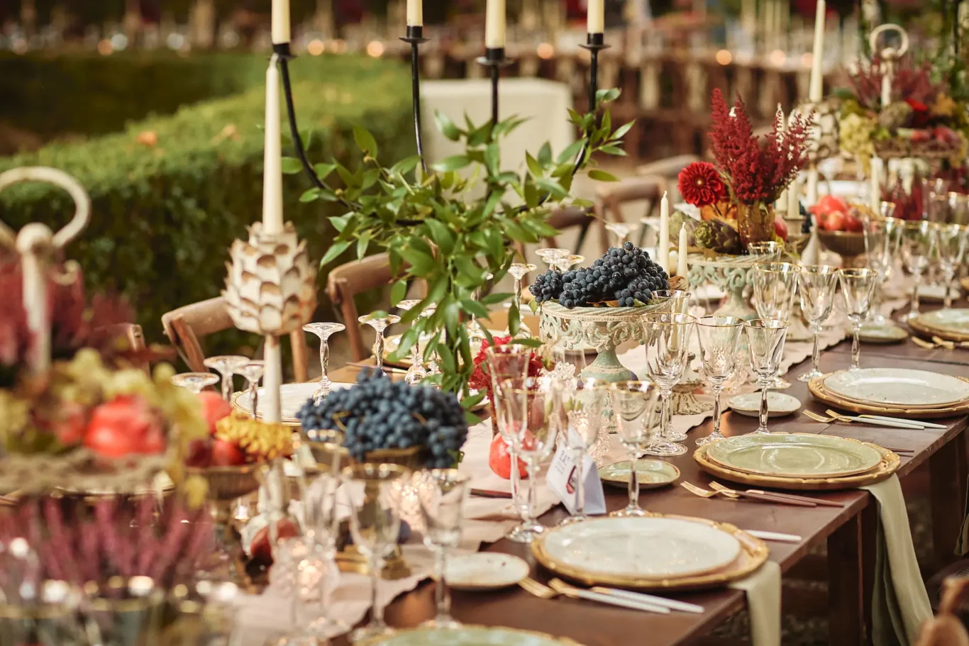 As evening descended, we ushered everyone to the rear courtyard for the grand reveal. Guests were truly wowed by the sight of a long, gracefully curved table set beneath the ancient trees. The tablescape was a romantic ode to autumn, adorned with candles and flowers in a rich, warm palette. To celebrate the season and the recent wine harvest, we incorporated lush grapes and deep red pomegranates into the design, adding a touch of organic elegance. The atmosphere was pure magic; a perfect, intimate setting for an unforgettable al fresco dinner under the stars.