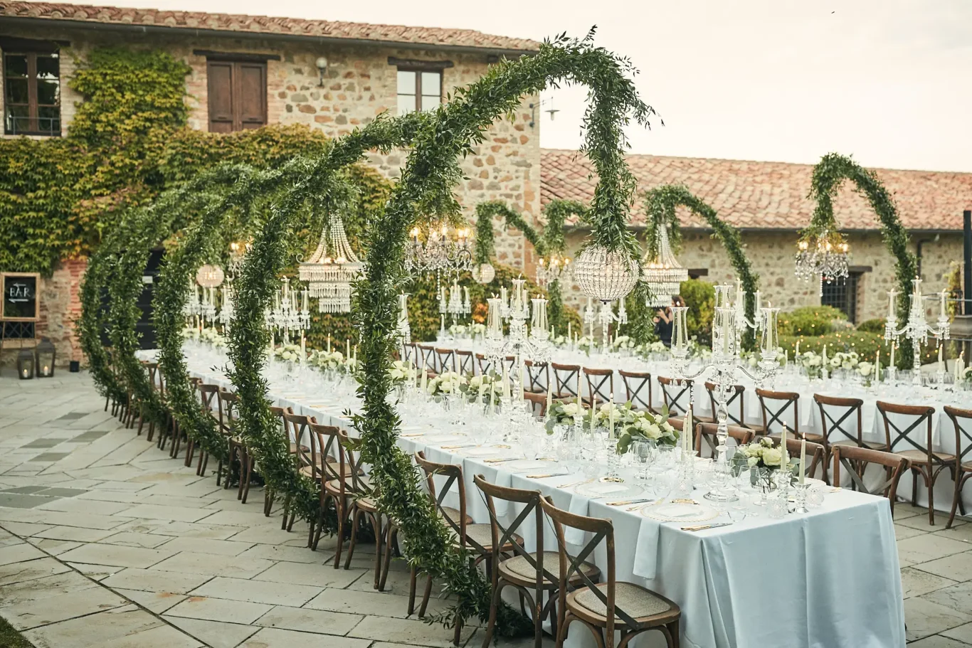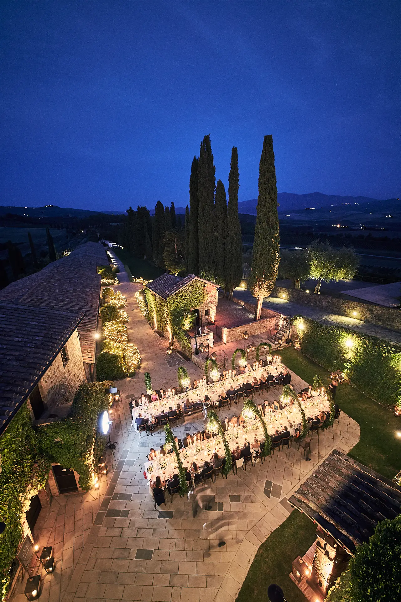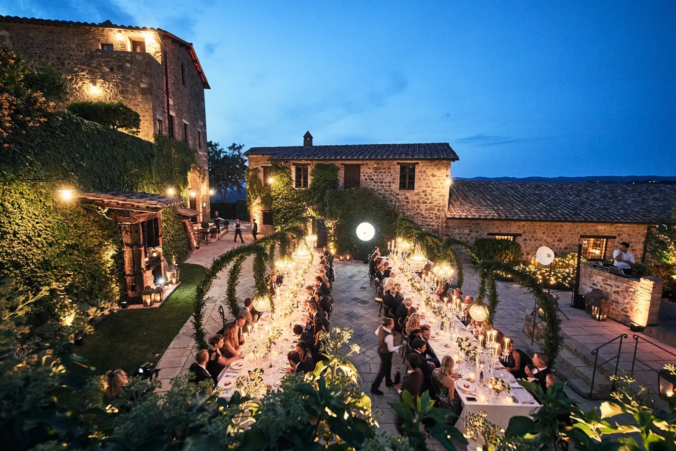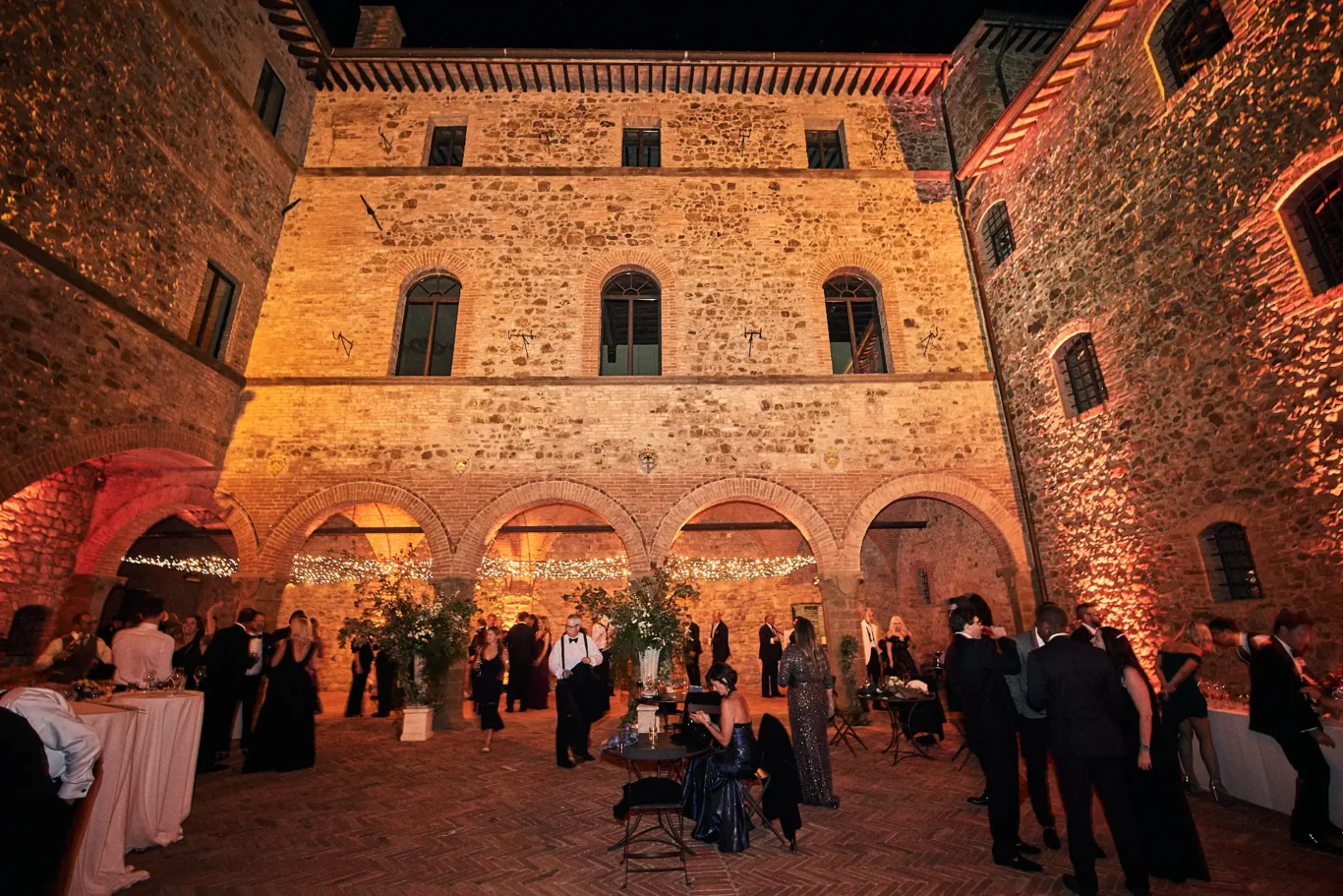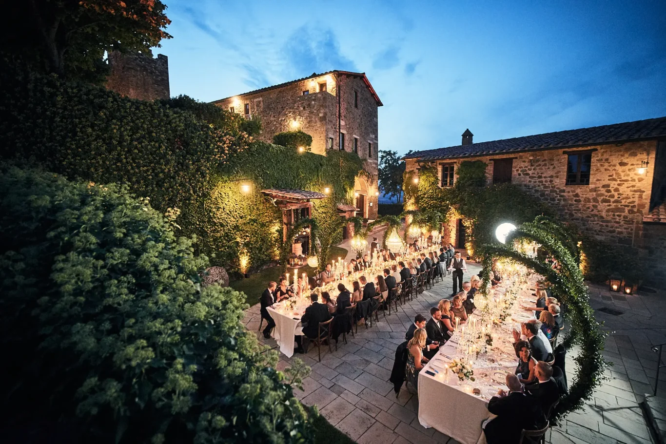 As dusk settled, guests were guided to a breathtaking sight: a long, imperial table set for an al fresco dinner in the courtyard before the Enoteca. This was the design centerpiece of the evening. Towering cypress trees framed the space, with elegant chandeliers suspended between them, casting a warm, romantic glow over the tablescape. The castle itself served as the most magnificent backdrop, creating a scene of timeless grandeur.