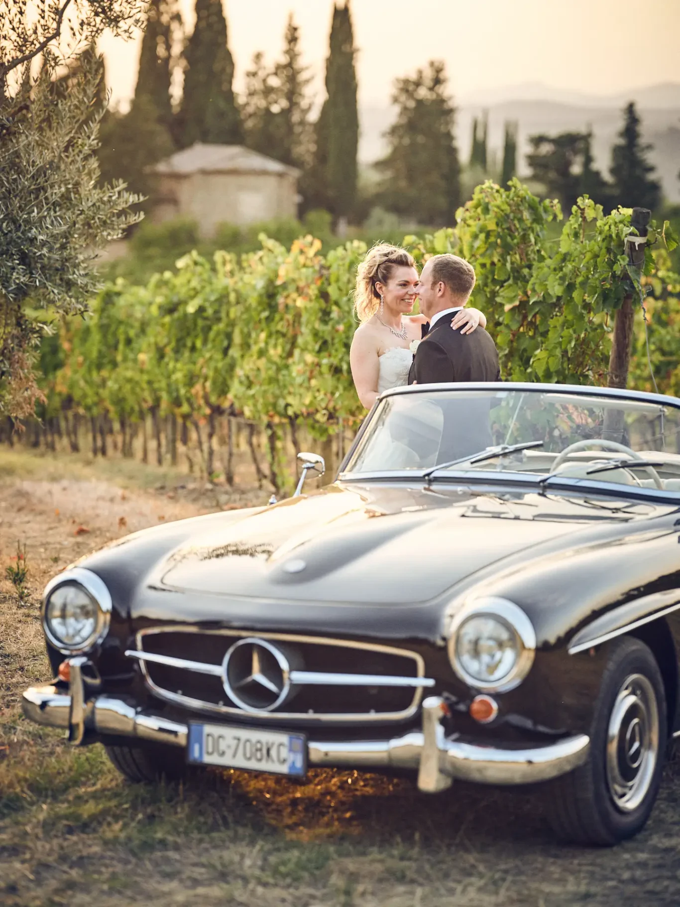 The day began not at the wedding venue, but at the stunning Castello di Vicarello, a secluded haven where Samantha and Tyler chose to stay. This allowed for a morning of tranquil preparation, away from the flurry of final setups. As our team managed every detail at Castello di Banfi, the couple could relax and soak in the moment. After their private first look amidst Vicarello’s rustic stone walls, they departed in a classic car, embarking on the scenic drive through the Tuscan hills toward their ceremony—a perfect, cinematic transition into the next chapter of their day.