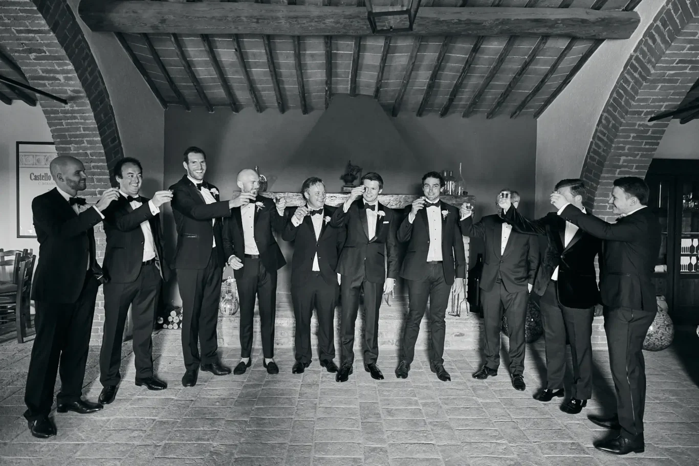 The day began with a beautiful sense of quiet excitement. Alisa prepared with her bridesmaids within the ancient, sunlit rooms of the castle, a space filled with history and grace. Meanwhile, Noah and his groomsmen were surrounded by the rustic character of the winery itself, sharing a toast amidst the very heart of the estate’s heritage. Our team coordinated every detail invisibly, ensuring both groups could savour these precious, final moments before the celebration began, completely relaxed and present.