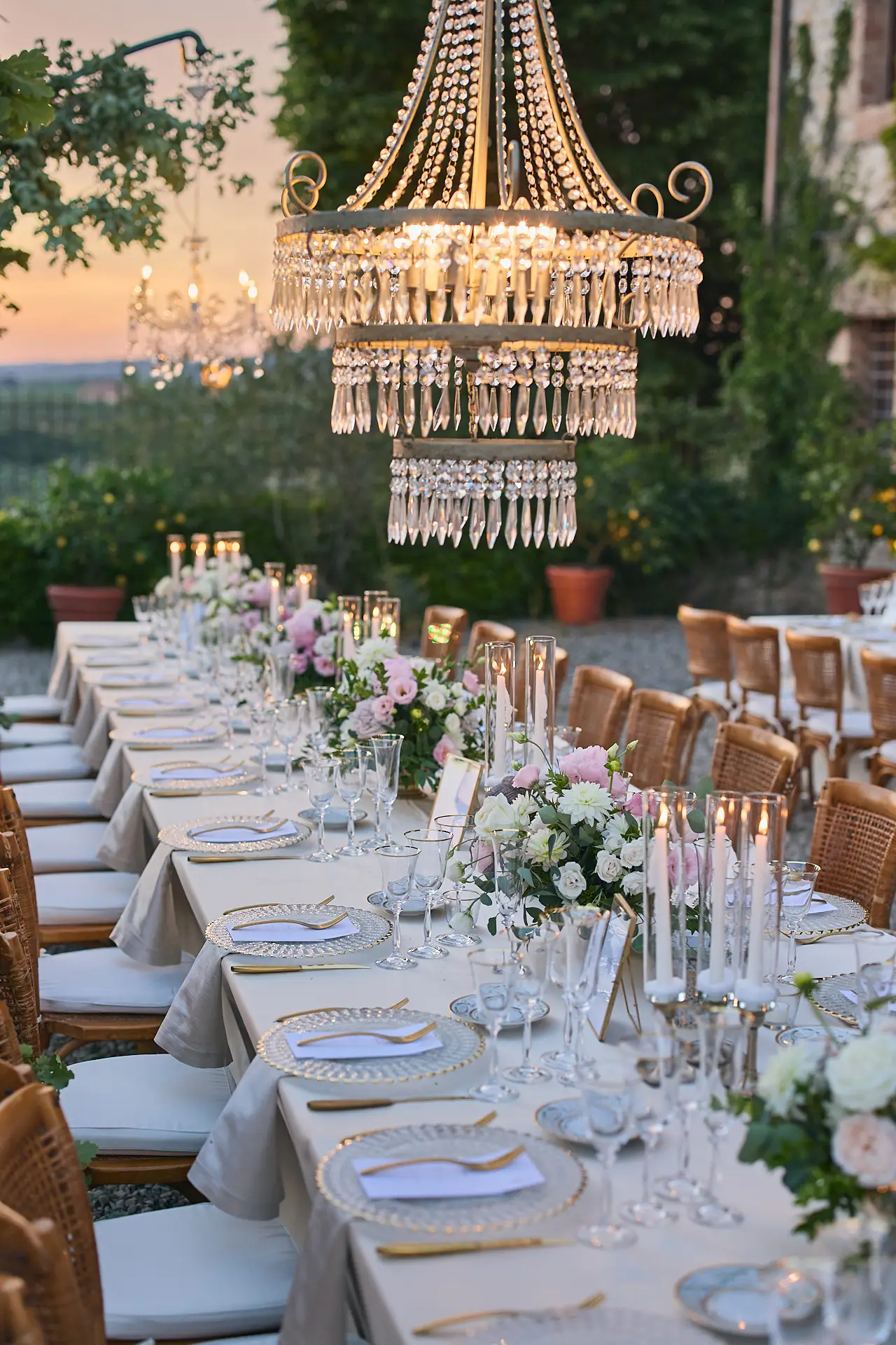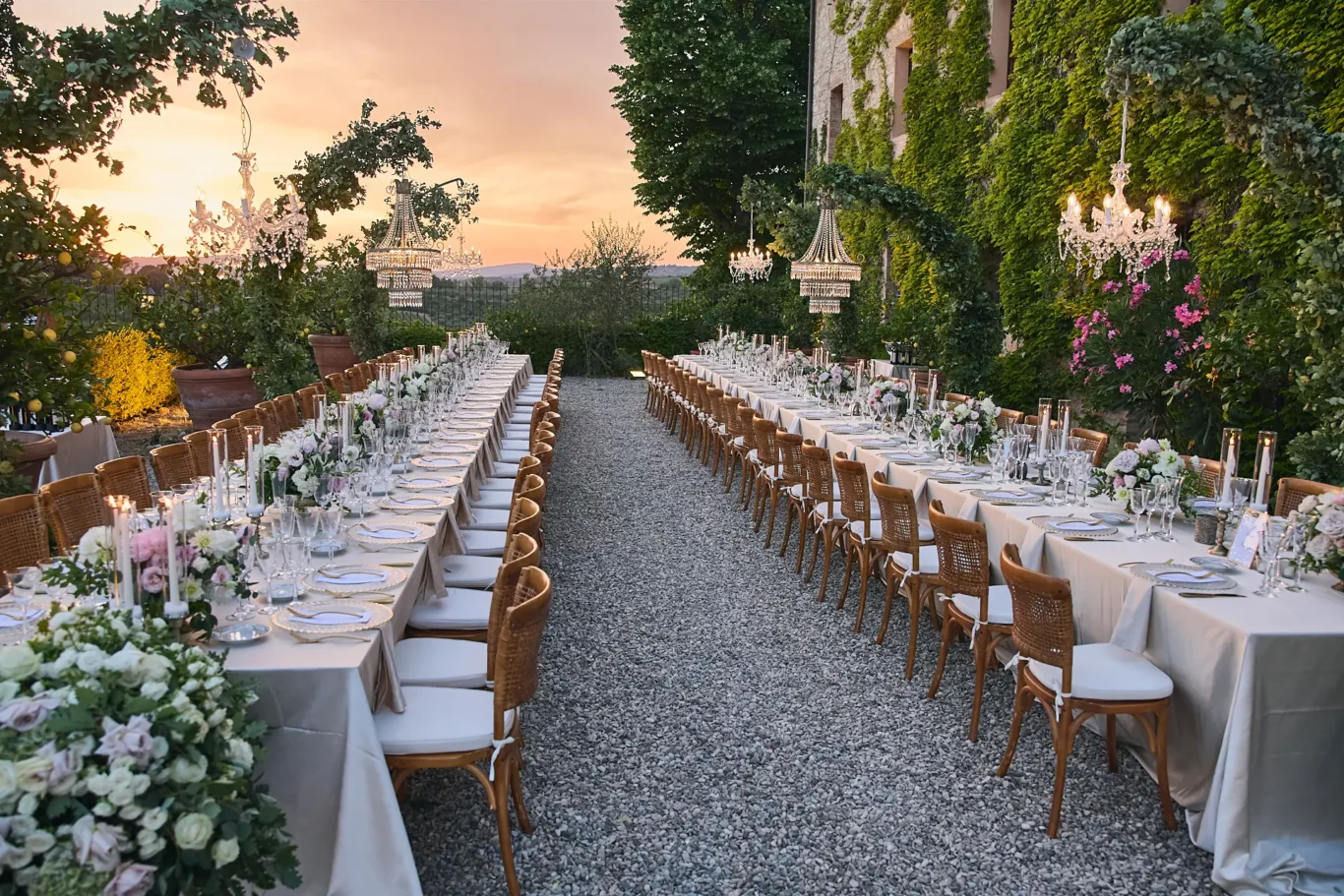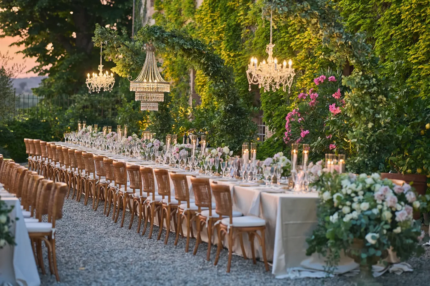 As twilight settled, we created a moment of pure magic. Guests were escorted from the aperitivo around the castle and through the historic Italian gardens. As they passed through the gates, they discovered the evening’s breathtaking surprise: two magnificent imperial tables set for dinner, running parallel to the castle’s stone facade. Above, a cascade of chandeliers cast a warm, romantic glow, transforming the space into an impossibly beautiful open-air ballroom. Moments like these, as our co-founder and photographer Jules will attest, are designed not just to be lived, but to be captured as iconic, lasting memories.