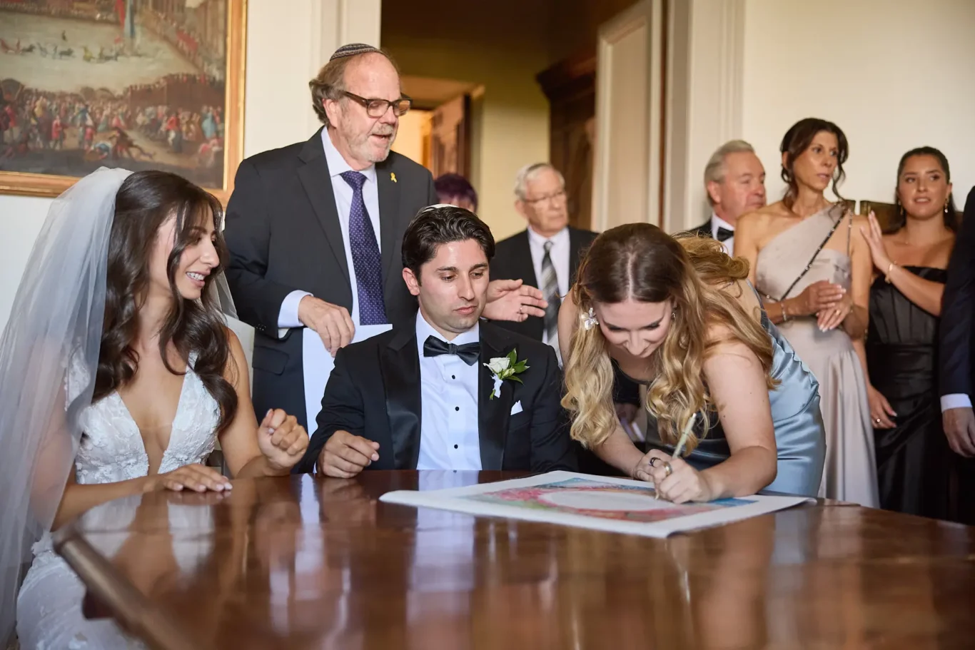 Following their emotional first look on the castle grounds, Hailey and Joshua retreated inside the castle for one of the day’s most significant moments: the Ketubah signing. We arranged an intimate and private gathering with their rabbi and immediate family, creating a deeply personal and meaningful start to their official union. While they shared this sacred tradition, guests began to arrive. Our team greeted them warmly, seamlessly ushering them into the breathtaking Italian gardens, where Champagne was served and the magnificent chuppah awaited. This invisible execution of logistics ensures that the guest experience is one of pure wonder, not waiting.