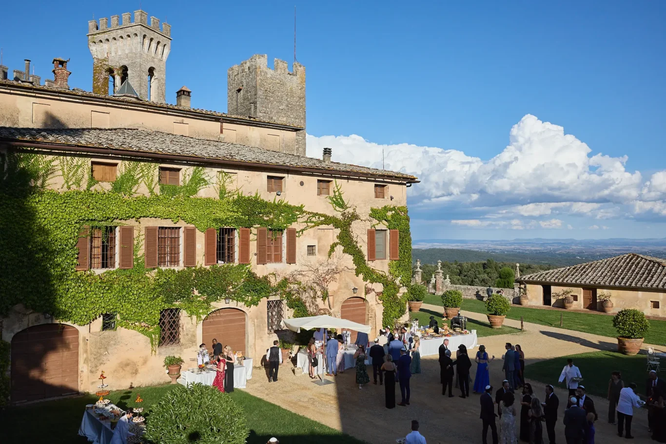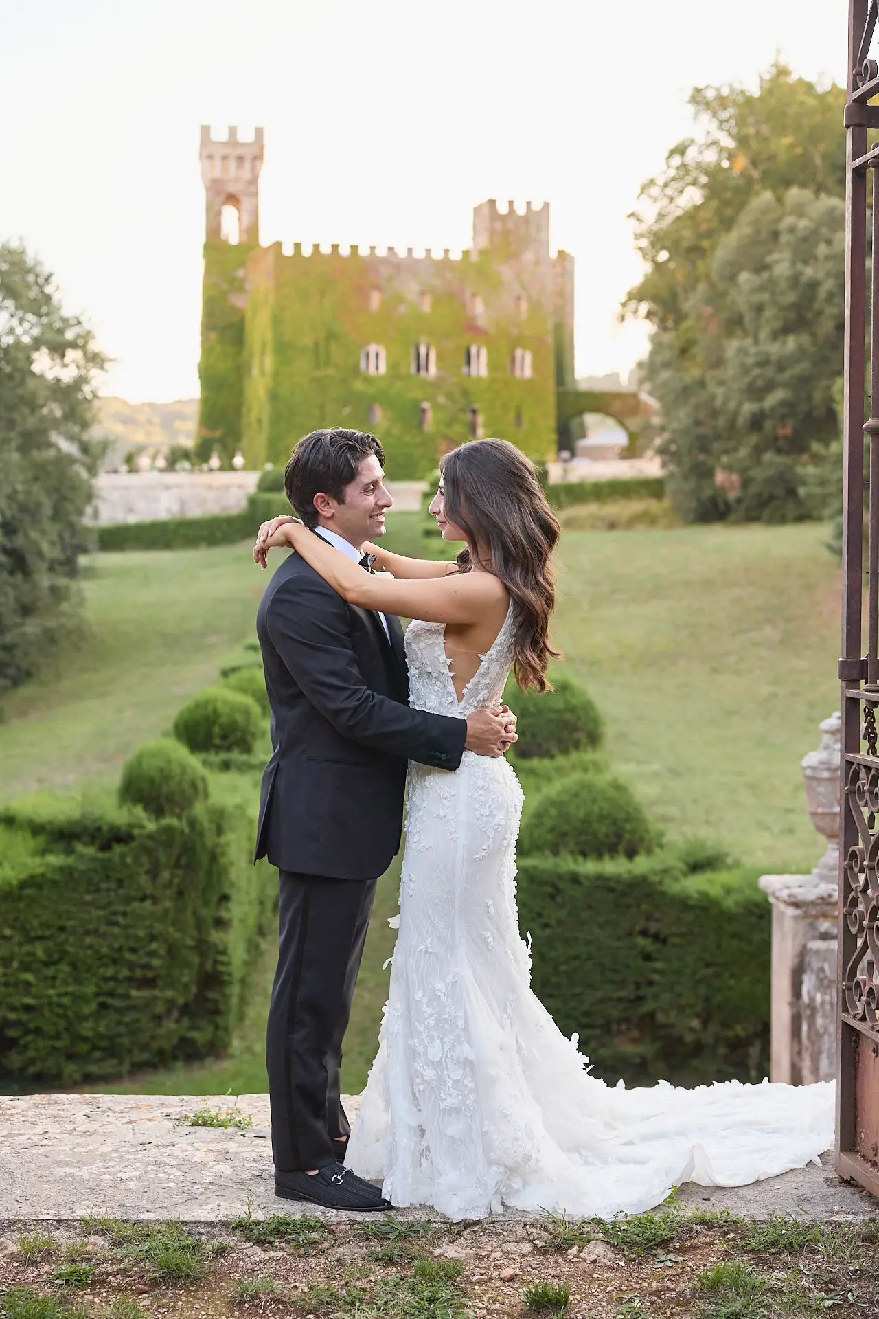As the final words of the ceremony were spoken and the glass was broken, an eruption of joy filled the gardens. The newlyweds led their guests to the castle’s side lawn for the cocktail hour, a quintessential Italian aperitivo. With the stunning castle as their backdrop, guests mingled over prosecco and exquisite canapés. The air was filled with laughter and the sounds of a live string quartet, creating an atmosphere of sophisticated celebration.