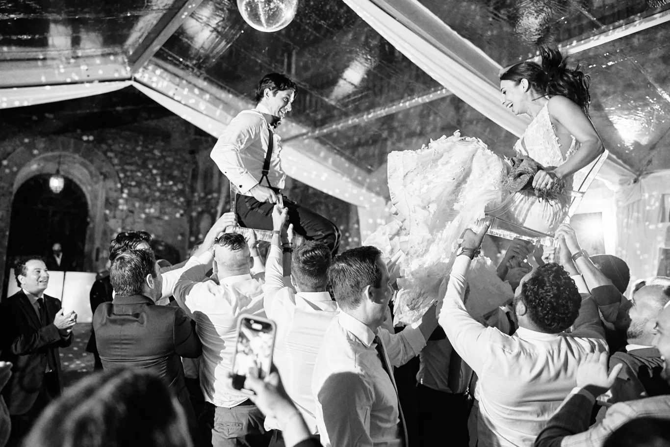 As the sun set, casting a golden glow over Tuscany, we revealed the evening’s masterpiece. The wedding reception unfolded under the stars in a space transformed into an open-air ballroom. Long, elegant tables were adorned with lush florals and soft candlelight, while magnificent chandeliers were suspended overhead, creating a breathtaking canopy of light against the night sky. The fairytale vision was now a reality. Every element, from the bespoke menu to the flawless service, was designed to let Hailey, Joshua, and their guests feel completely immersed in the magic of the moment.