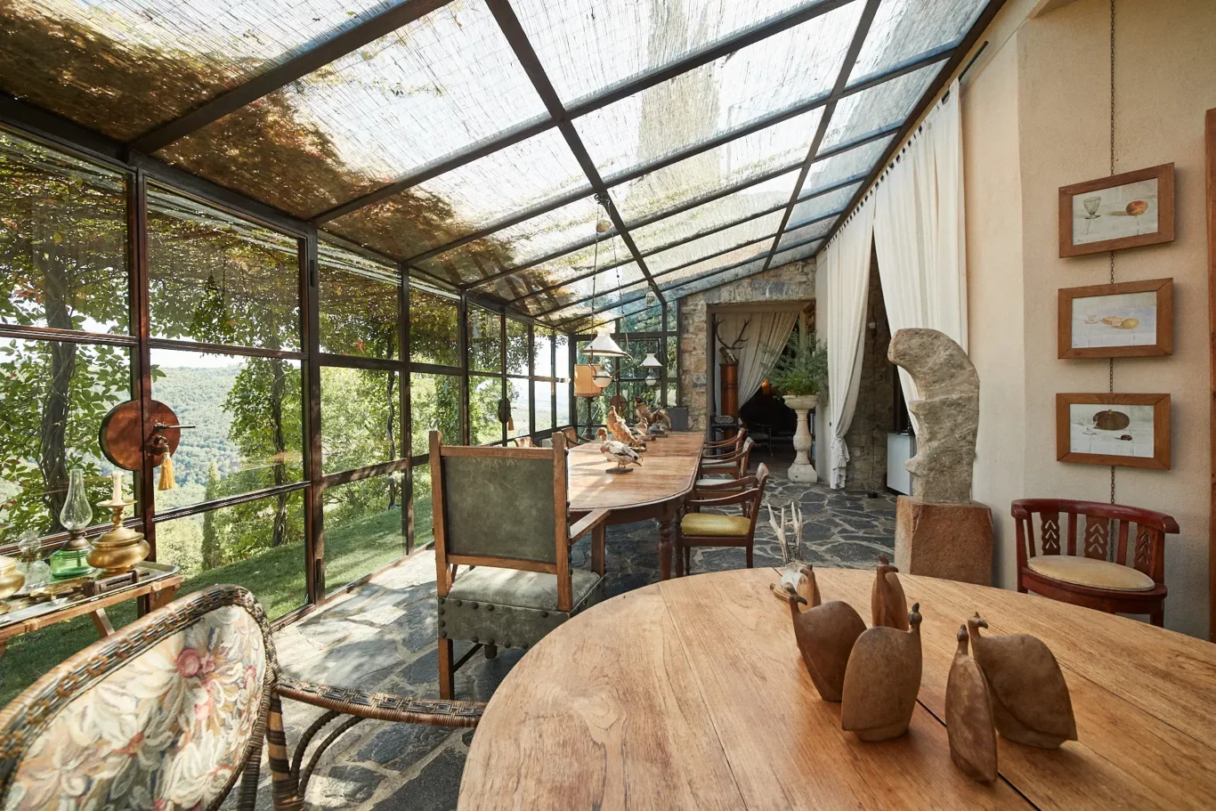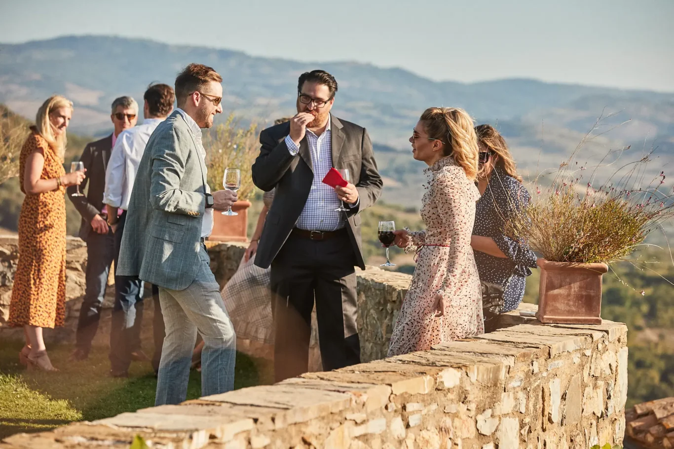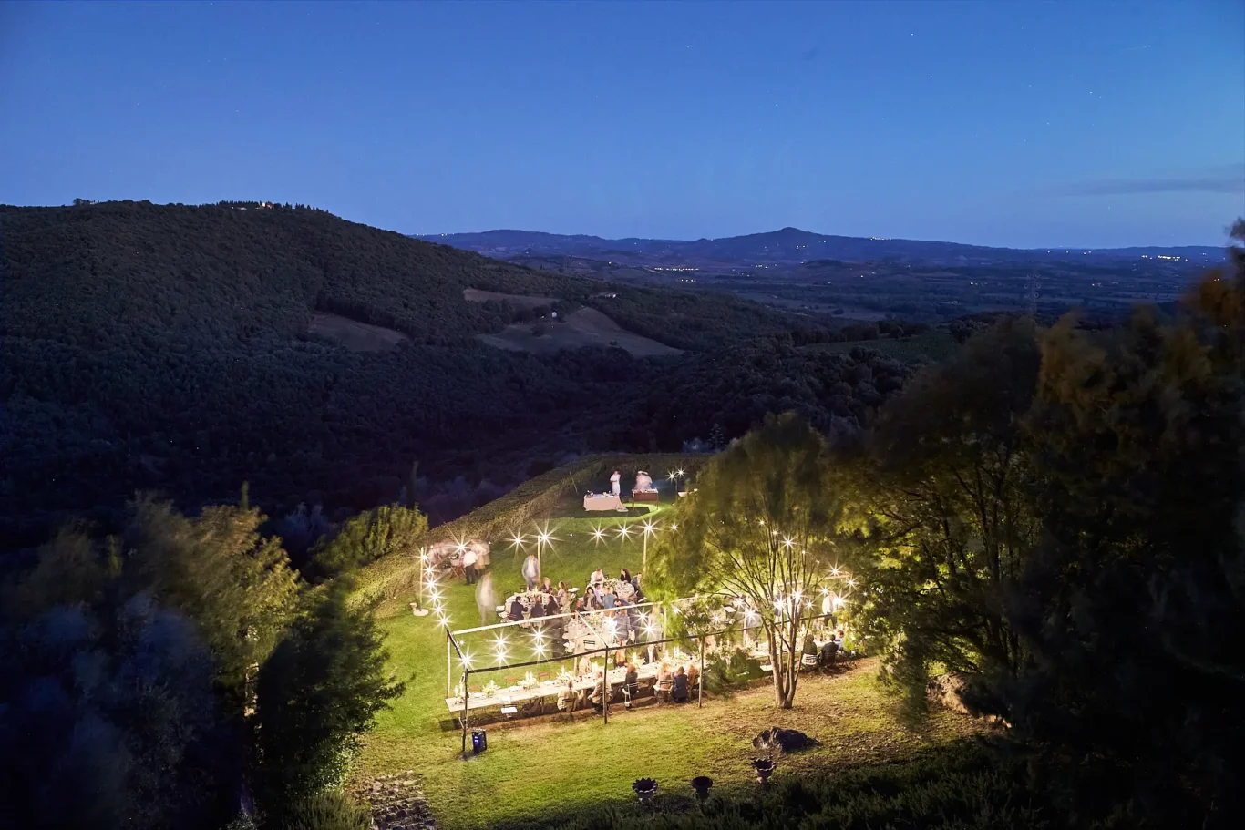 As guests sipped on fine Italian wine and handcrafted cocktails, they were free to explore. Many were drawn to the upper terraces, which offer breathtaking, panoramic views of the Tuscan landscape. As Sabrina often notes, the guest journey is paramount. We designed this initial part of the evening to be fluid, encouraging discovery and conversation while the sky turned from gold to deep indigo.