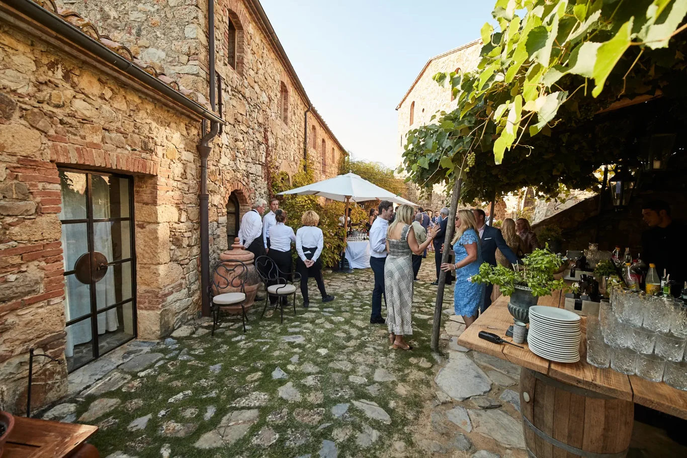 The evening began as the late summer sun started its descent over the Maremma hills. Guests were welcomed into the ancient stone courtyard of Castello di Vicarello, where the cool, energetic notes of a live jazz trio filled the air. This was the perfect introduction to a luxury wedding Tuscany experience: sophisticated yet entirely relaxed.