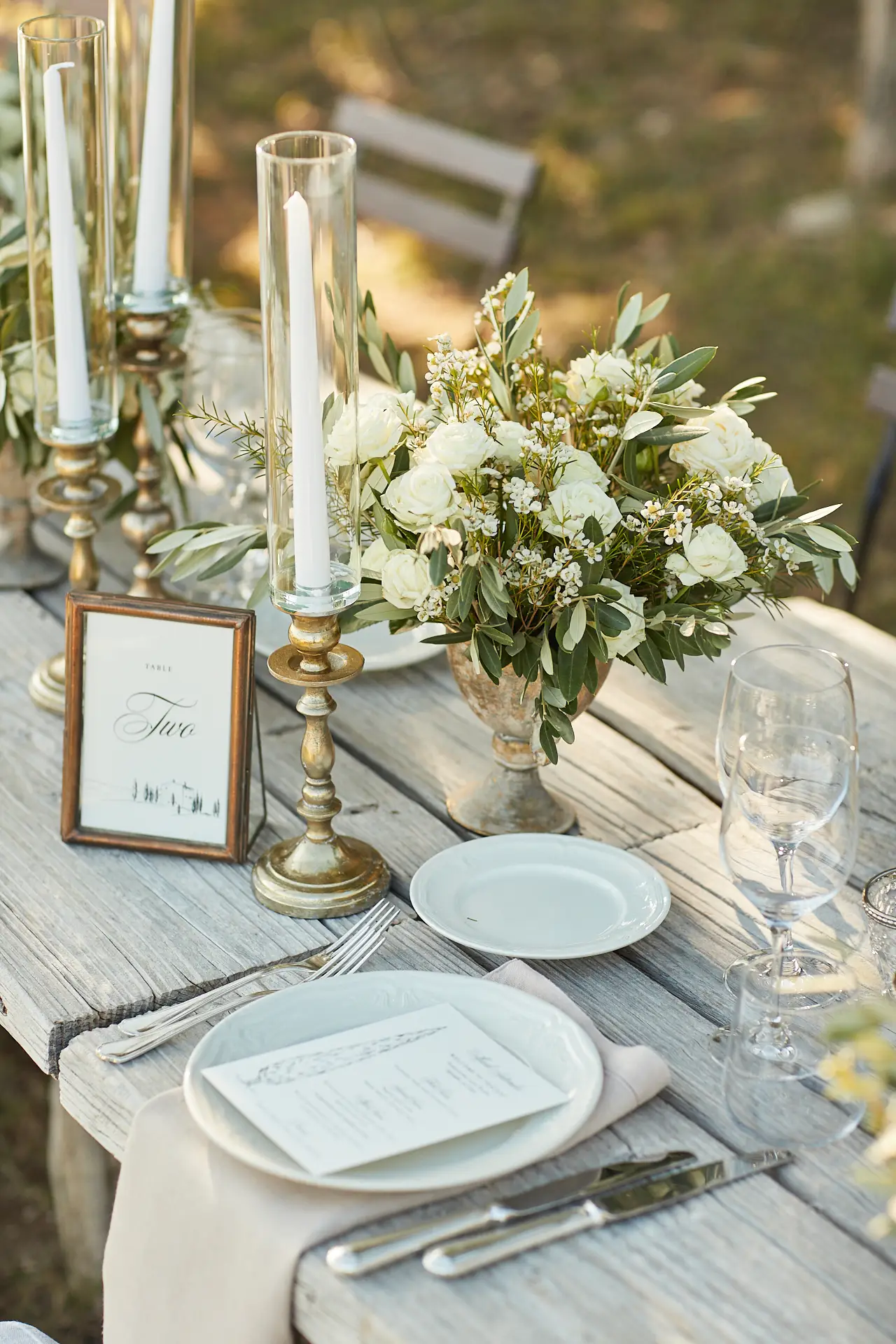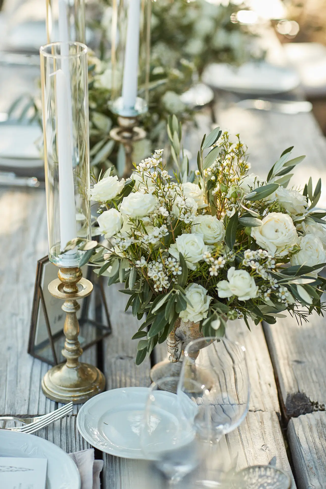 From the courtyard, guests were guided to the main lawn, where a breathtaking dinner setting awaited them. We created a long, rustic tablescape that felt both grand and intimate, set under a canopy of twinkling lights. The design was the epitome of rustic chic, with natural linens, abundant white and green florals, and flickering candlelight that created a magical glow.
