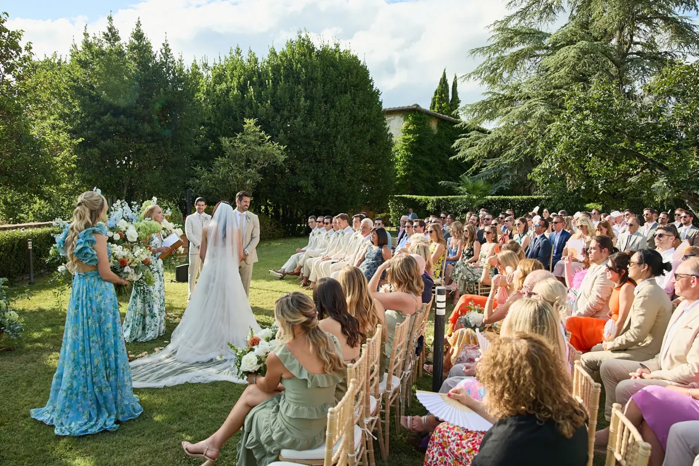 For their vows, Sara and Justin chose the villa’s magnificent Lemon Garden. This stunning terrace offers one of the most breathtaking backdrops in Tuscany, with the iconic skyline of Siena painting the horizon. As guests took their seats, the air was filled with soft classical music and the warmth of the August sun. The ceremony was a beautiful testament to their love, made all the more powerful by the timeless landscape that surrounded them. Our team managed the precise timing and guest flow, ensuring a seamless and emotionally resonant experience for everyone.