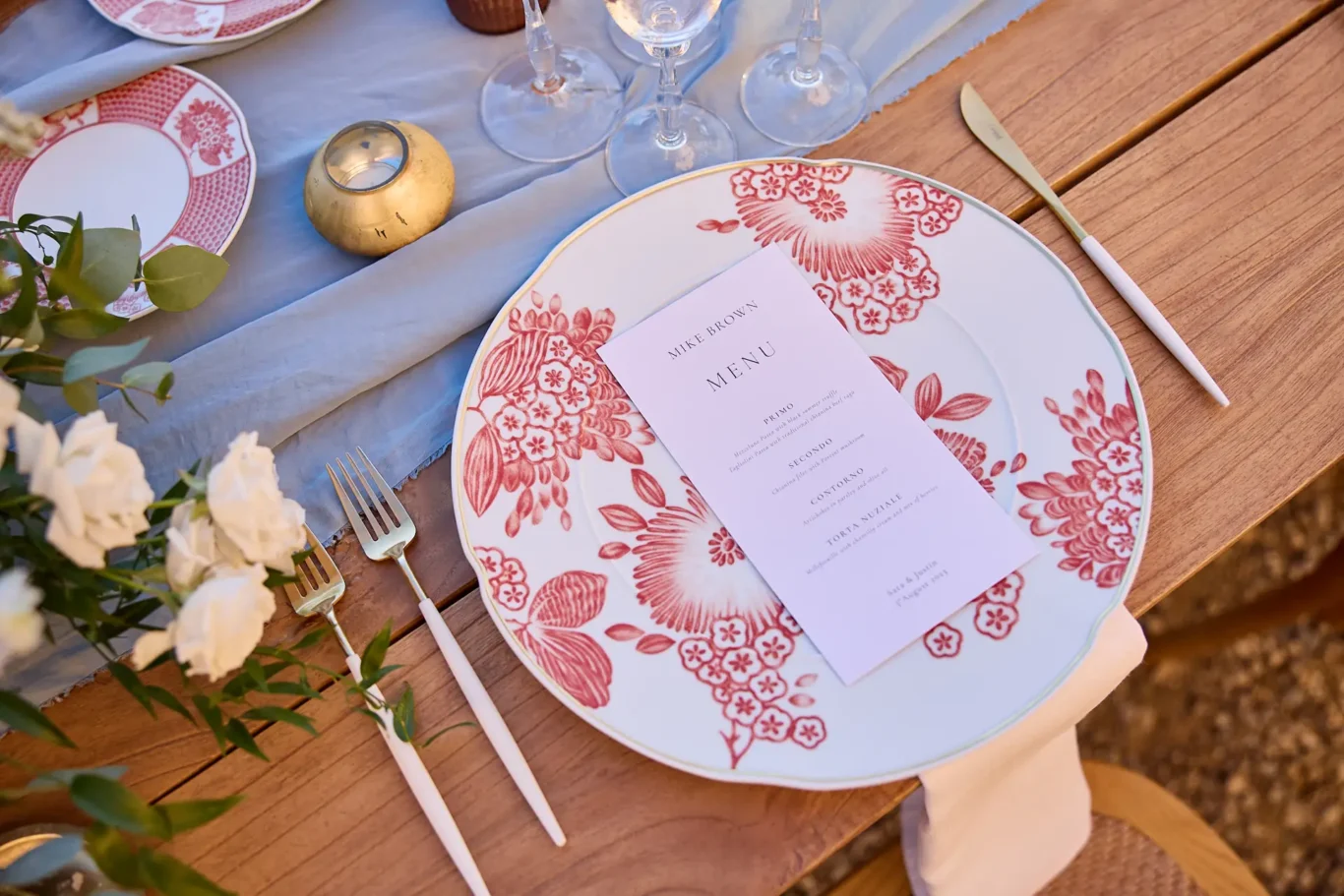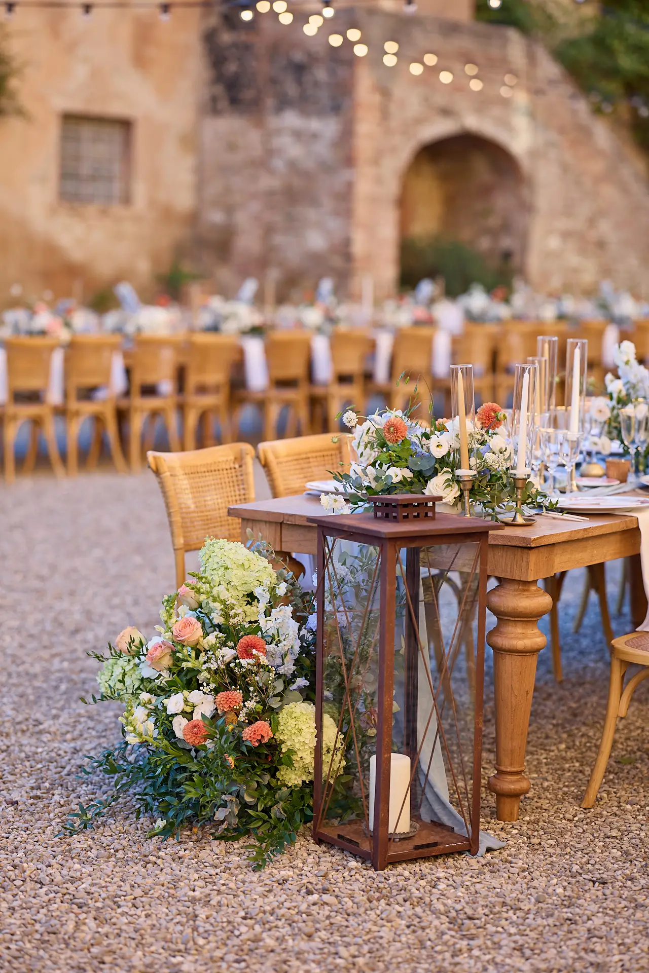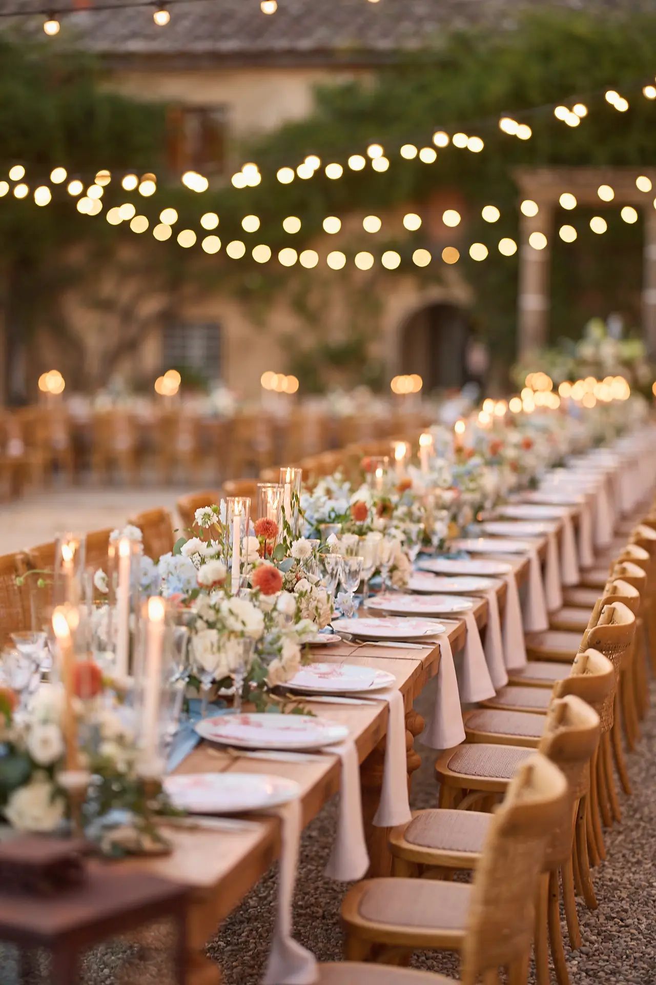 As the sun began to set, casting a golden glow over the countryside, we invited guests into Villa Catignano’s main courtyard for the reception. The transformation was breathtaking. A long, elegant tablescape was set for an al fresco dining experience under a twinkling canopy of string lights.