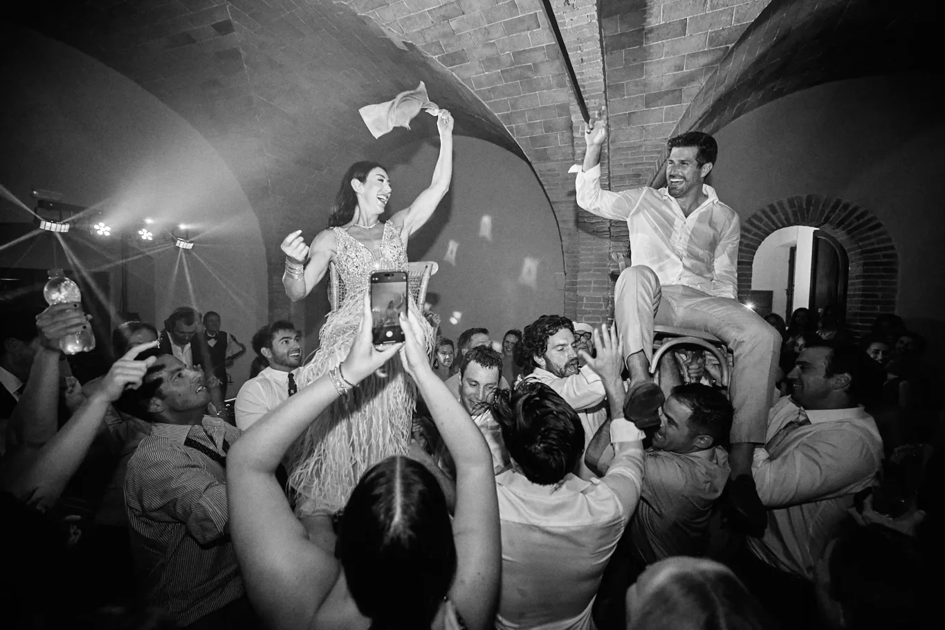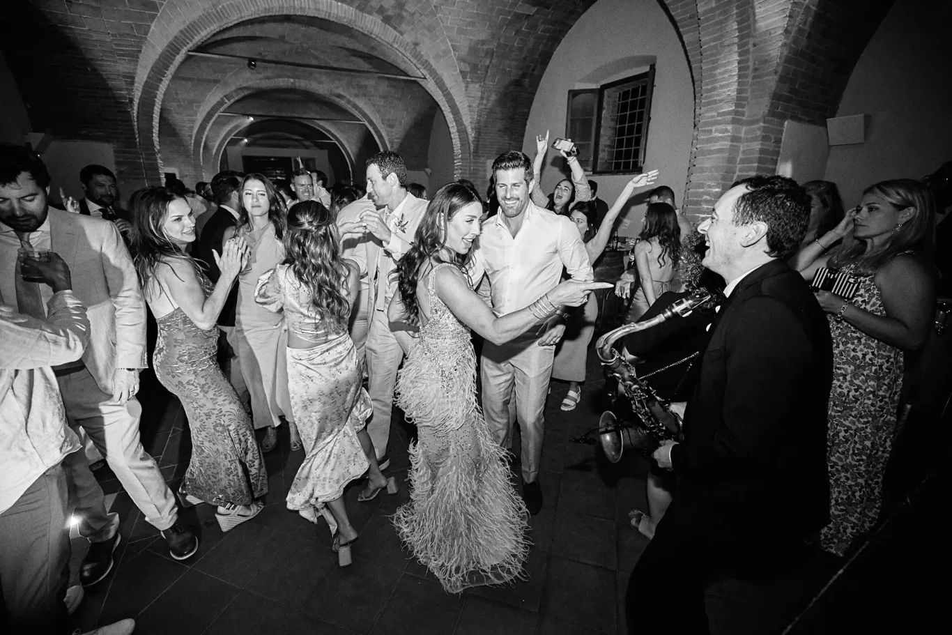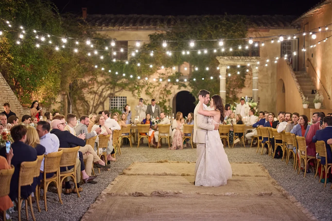 The energy was pure magic. Sara and Justin performed their first dance on beautiful rugs placed directly among the guest tables, creating an incredibly intimate and inclusive moment. After a delicious meal and heartfelt toasts, the cake was cut, and the party moved indoors. A live DJ and a dynamic saxophonist took the stage, igniting the dance floor and ensuring the celebration continued long into the warm Tuscan night.