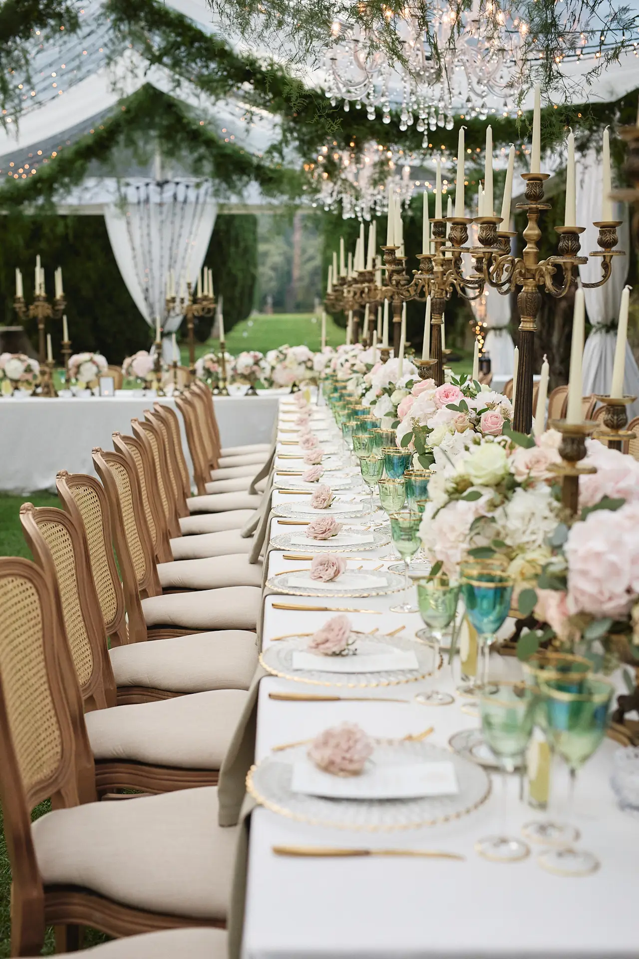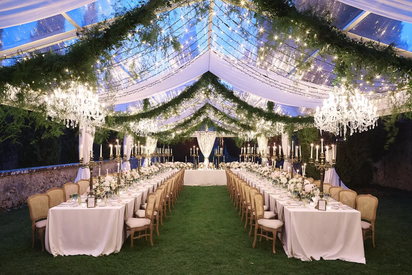 Returning to Villa Cetinale felt like a grand homecoming. Guests were welcomed into the rear avenue, a breathtaking space leading to the villa, where a beautiful marquee glowed under a canopy of fairy lights. Live music from a jazz soul band filled the air, creating a sophisticated and vibrant atmosphere for the dinner reception. The design was one of timeless elegance, allowing the grandeur of the villa and the warmth of the celebration to take center stage.