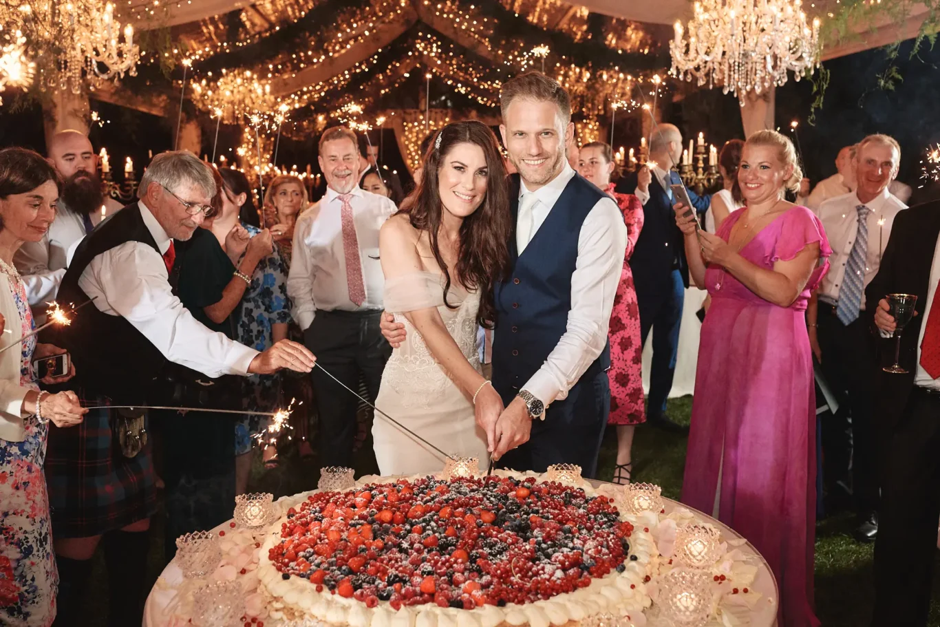 Later, guests were invited back outside for a final, breathtaking surprise. In a stunning work of creativity, a bespoke light show was projected onto the rear façade of the villa. The projection artfully merged intelligent graphics with family images, telling Gina and Alex’s story in a way nobody had ever seen before. It was a moment of pure astonishment that left every guest speechless. The party continued with a DJ set indoors, concluding a truly fantastic wedding day late into the night.