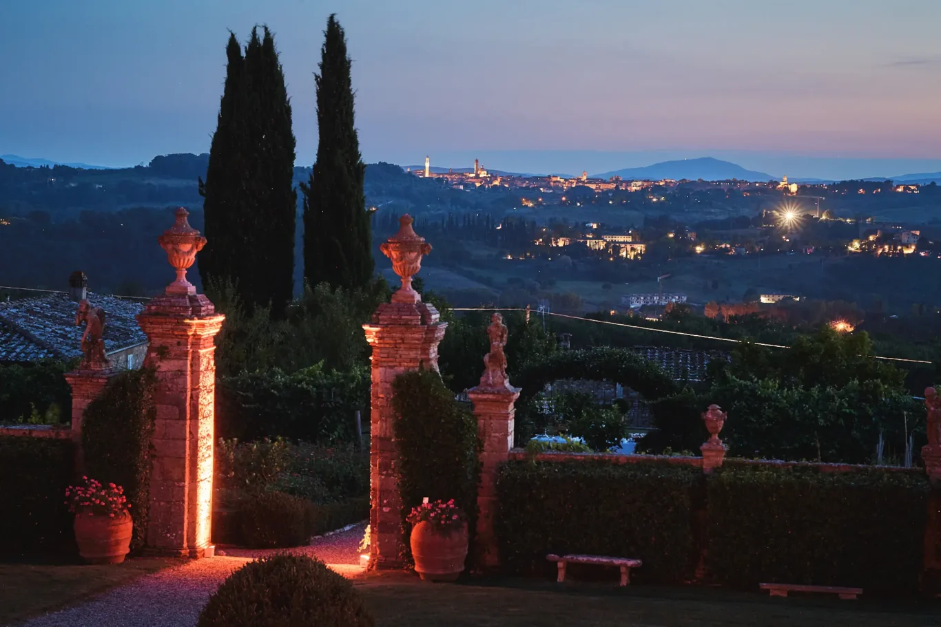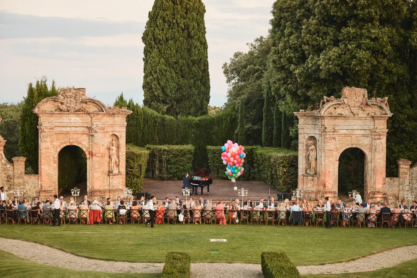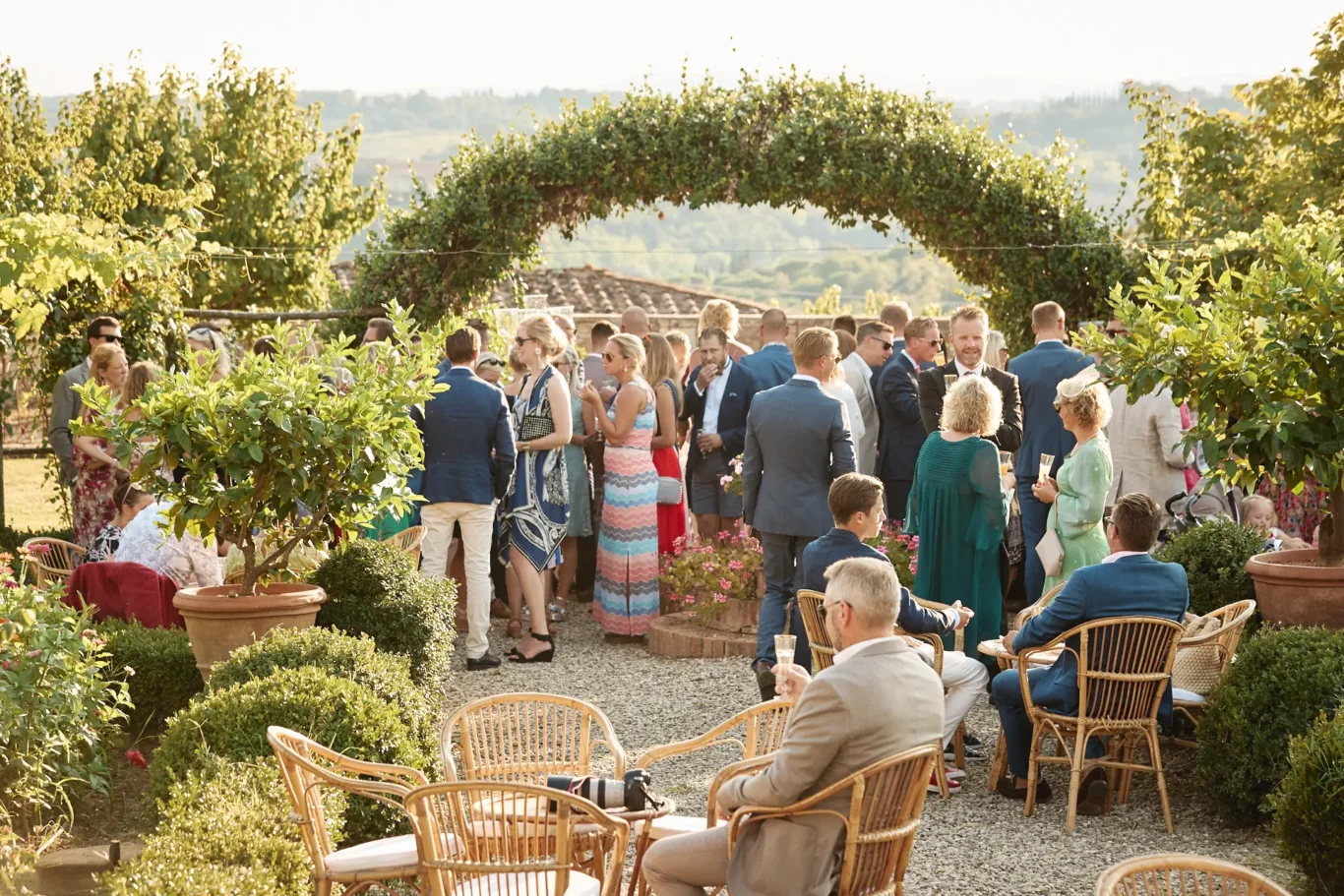 As guests stepped through the gates, they were instantly enveloped in the villa’s historic charm. Before them lay pristine Italian gardens, stunning architecture, and an incredible panoramic view of Siena in the distance. Our team was there to greet everyone with chilled Prosecco and a curated selection of canapés, allowing them to mingle, absorb the spectacular new surroundings, and feel instantly cared for.