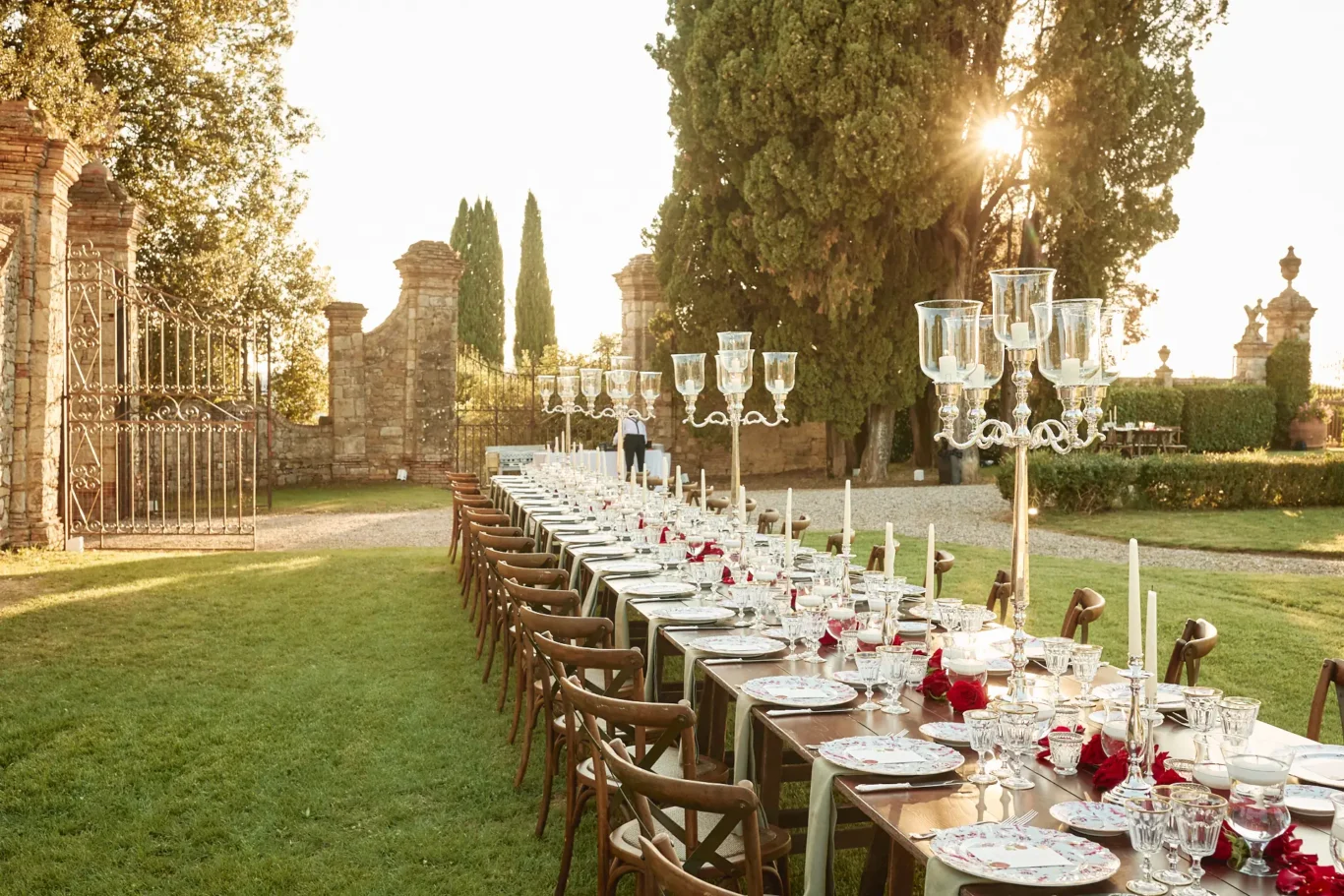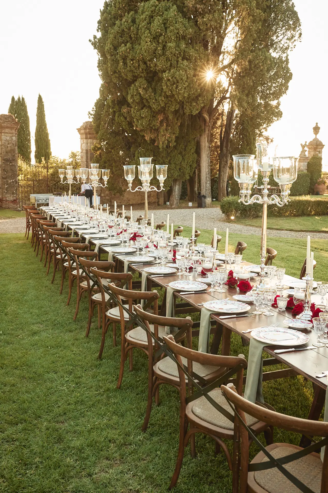 When it was time for dinner, we invited guests to take their seats at a magnificent long imperial table. The décor was intentionally simple and elegant, with clusters of deep red roses adding a touch of romance without distracting from the natural beauty of the setting. It was free seating, encouraging a relaxed, family-style atmosphere.