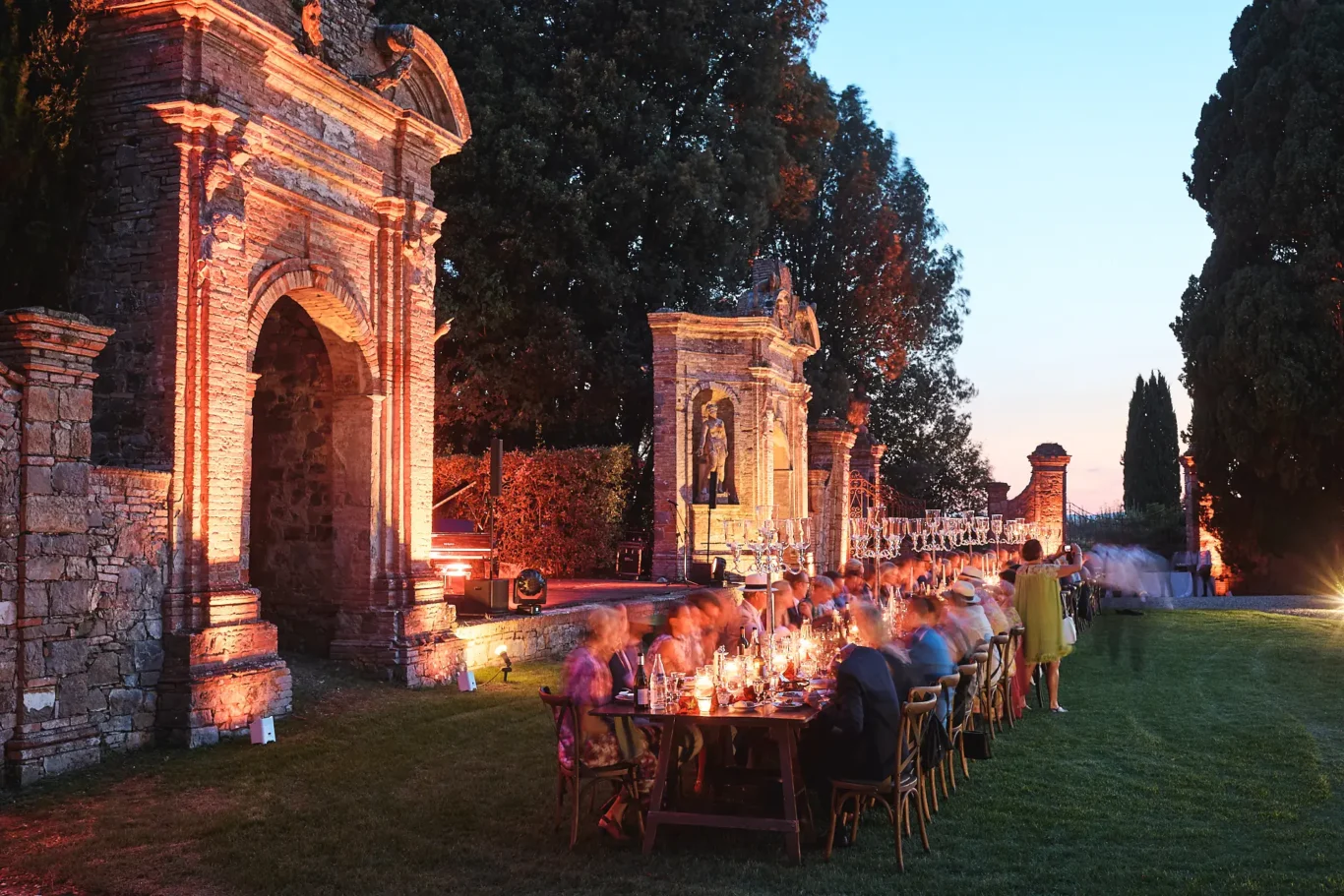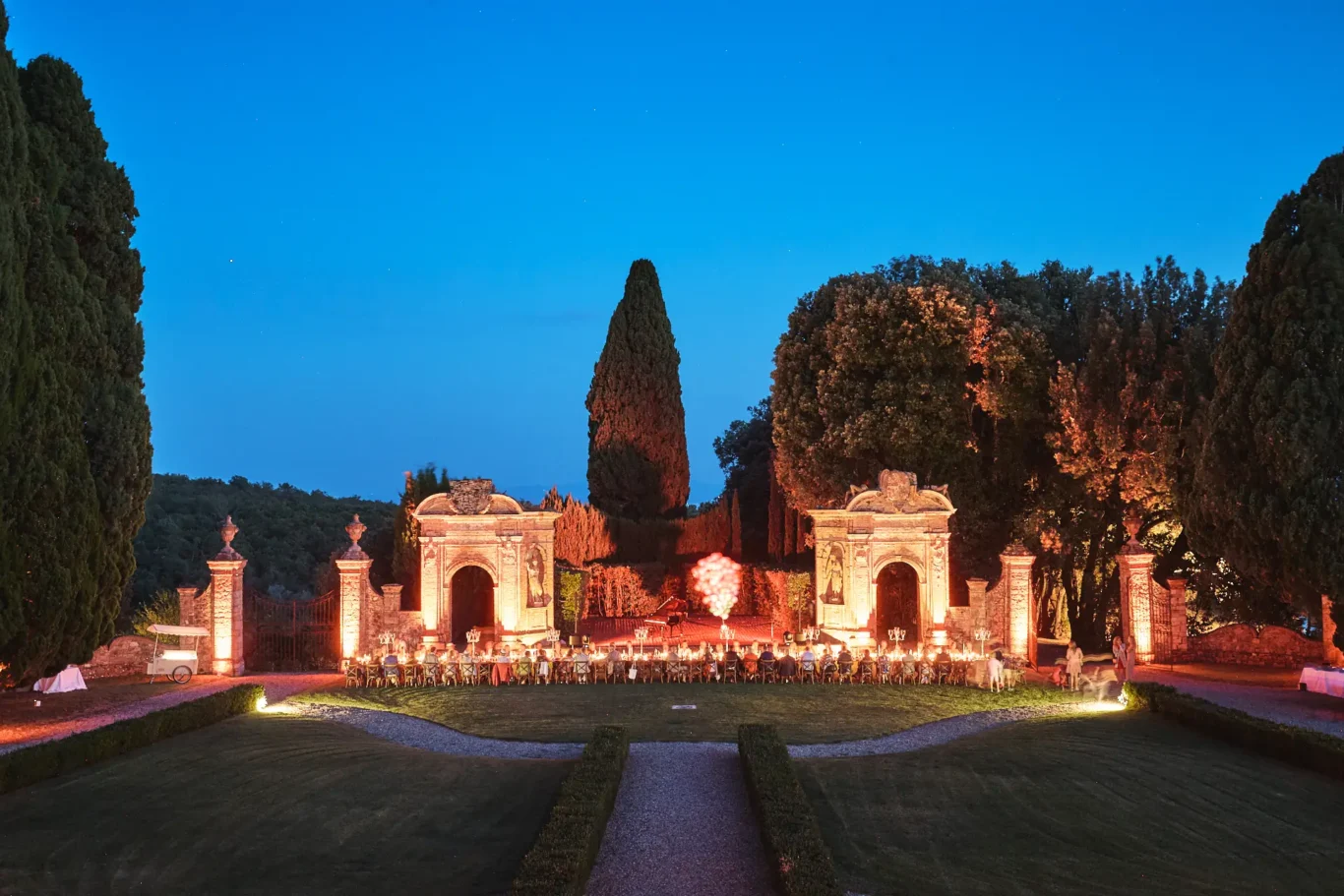 For the meal, Lisa and Niklas wanted to give their guests a truly authentic taste of Tuscany. We arranged for a classic Tuscan barbecue, with the celebrated Fiorentina steak as the star of the show. The barbecue itself was set up on the lawn, providing a bit of culinary theatre as chefs masterfully prepared the feast. As dusk settled and the stars began to appear, our carefully placed uplighting illuminated the villa’s dramatic architecture, transforming the space into a magical, glowing backdrop. At the perfect moment, the happy couple stood to make a heartfelt welcome speech, officially kicking off their wedding celebration surrounded by the warmth and support of their family and friends.