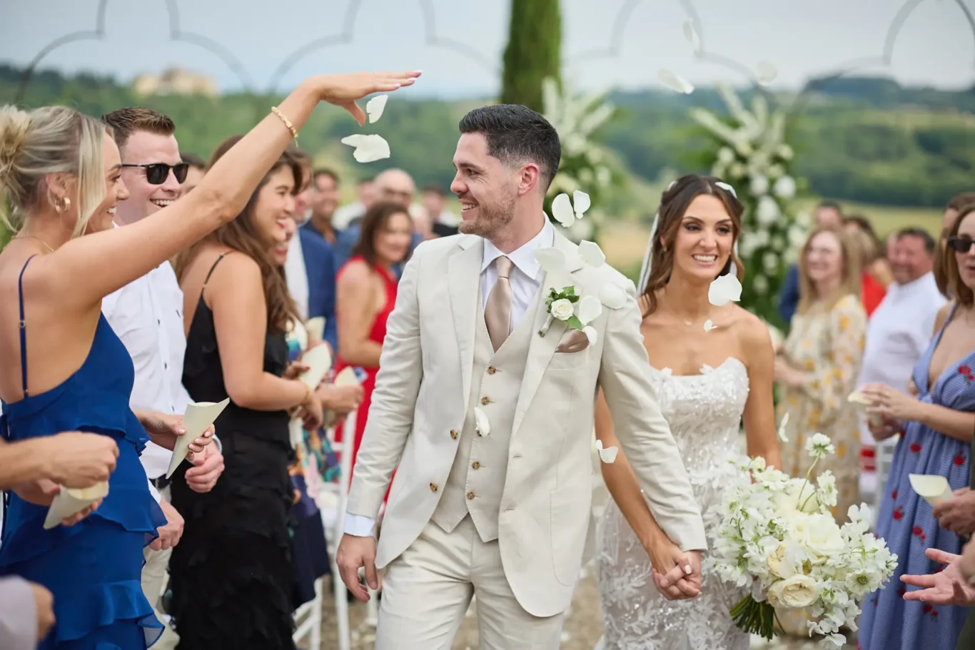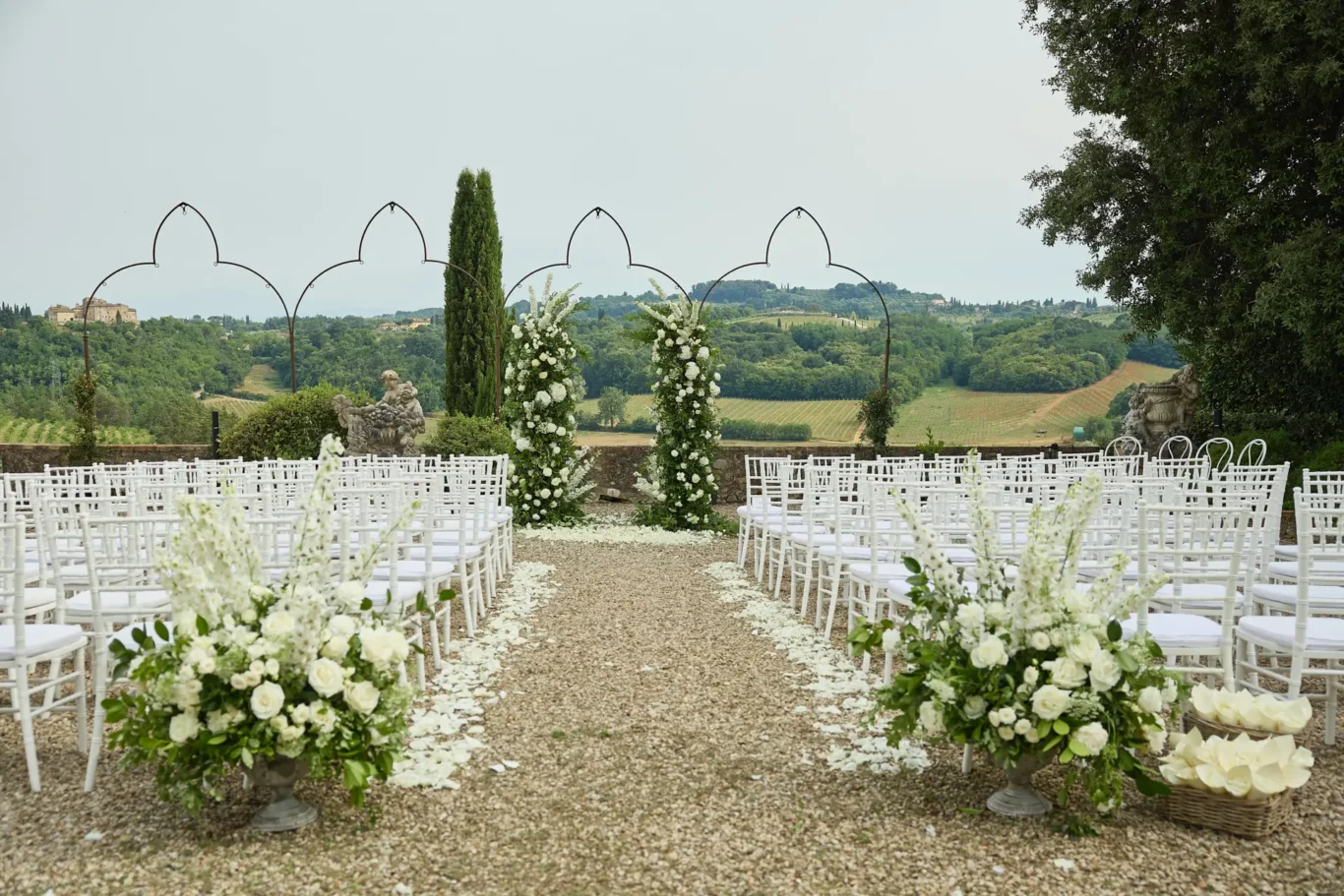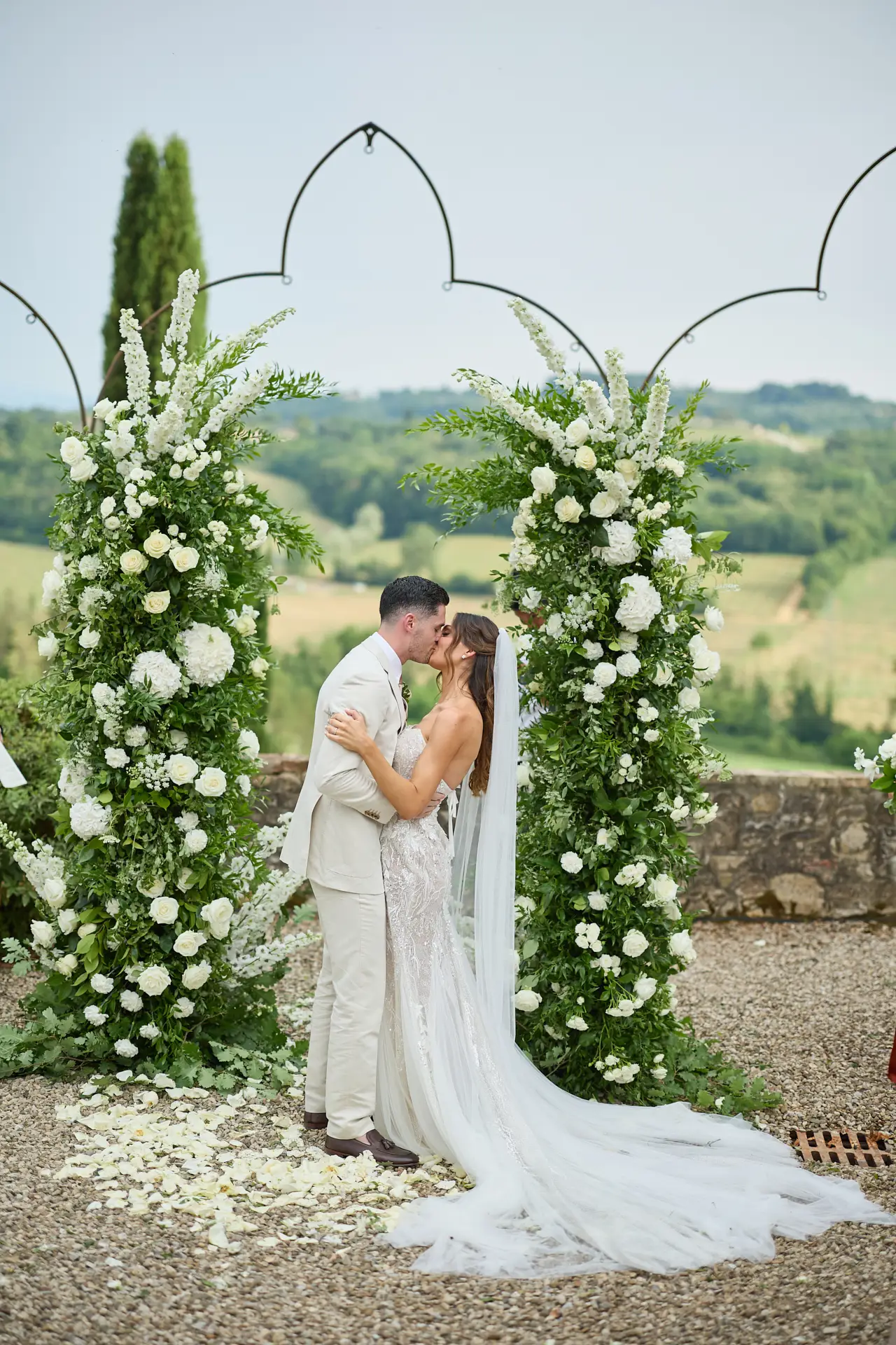 The ceremony was held outdoors, a breathtaking scene overlooking the golden vineyards that stretch as far as the eye can see. As Sabrina always advises, when your backdrop is as magnificent as the Tuscan landscape, your design should complement it, not compete with it. Antoinette and Keith exchanged vows under a minimalist floral arch adorned with white roses and eucalyptus, a simple and elegant frame for their commitment. As the sun began its descent, the soft, cinematic light created a dreamy ambiance that felt both sacred and profoundly romantic.