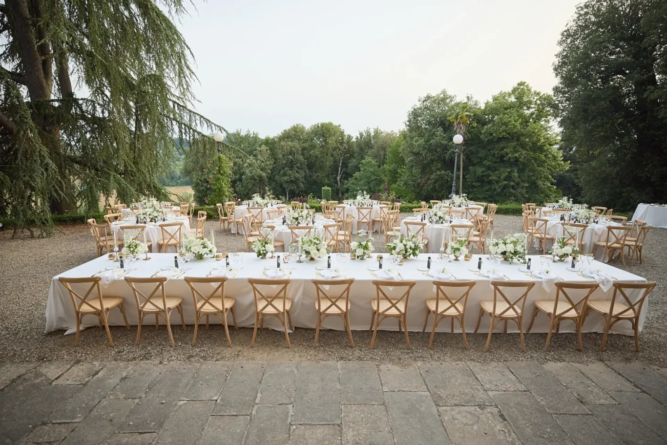 Following the ceremony, guests were welcomed to the villa’s grand front terrace for the reception. To create a sense of family and intimacy, a long head table for the couple and their loved ones overlooked a sea of beautifully arranged round tables for their guests. The design was effortlessly beautiful, with simple runners of greenery and white flowers, flickering candles, and muted-toned place settings that enhanced the relaxed atmosphere. Guests enjoyed a traditional Tuscan menu paired with exceptional local wines, with heartfelt speeches punctuated by laughter and the joyful clinking of glasses.