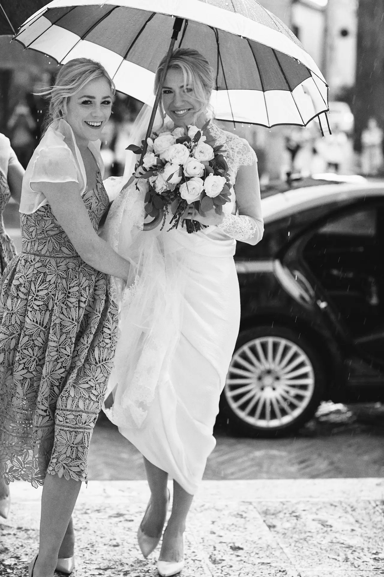 Upon arrival, a torrential downpour began. This is the moment where true planning is tested. With precise coordination, we ensured Francesca made it from her car to the church doors, shielded and serene, a picture of calm amidst the chaos. Once inside, the world outside melted away. The ceremony was joyful, emotional, and everything it should be, a sacred bubble of love oblivious to the floods and hail outside. And then, as if on cue, a moment of magic. As they sealed their vows, the sun broke through the clouds, streaming through the church’s glass windows and illuminating the couple in a heavenly glow.
