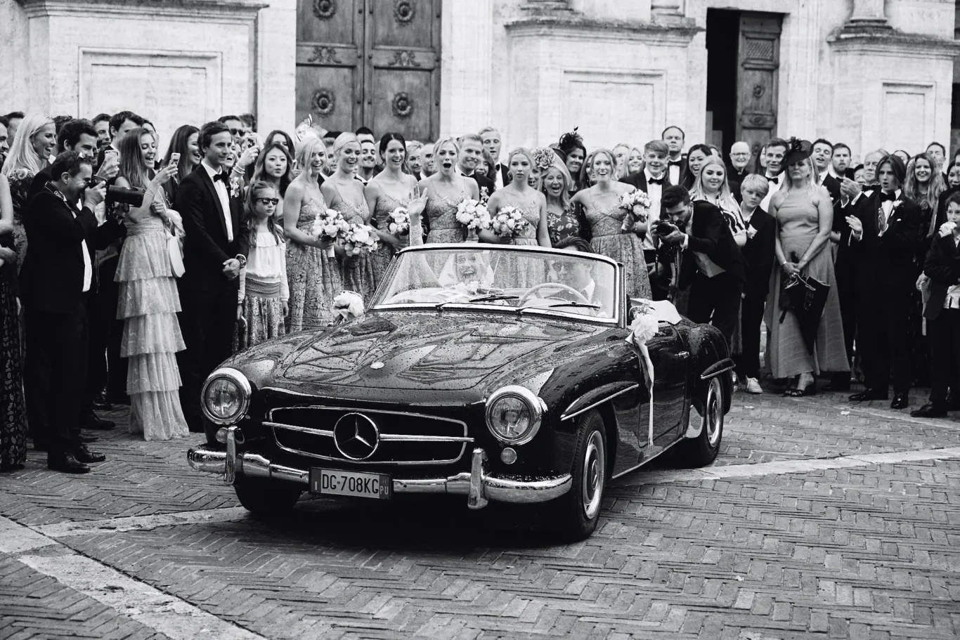 Exiting the church, guests showered the newlyweds with cascades of rice, a wonderful Italian tradition symbolizing luck and prosperity, now set against the bright, clean piazza. It was a cinematic transition from the solemnity of the cathedral to the pure celebration that lay ahead.