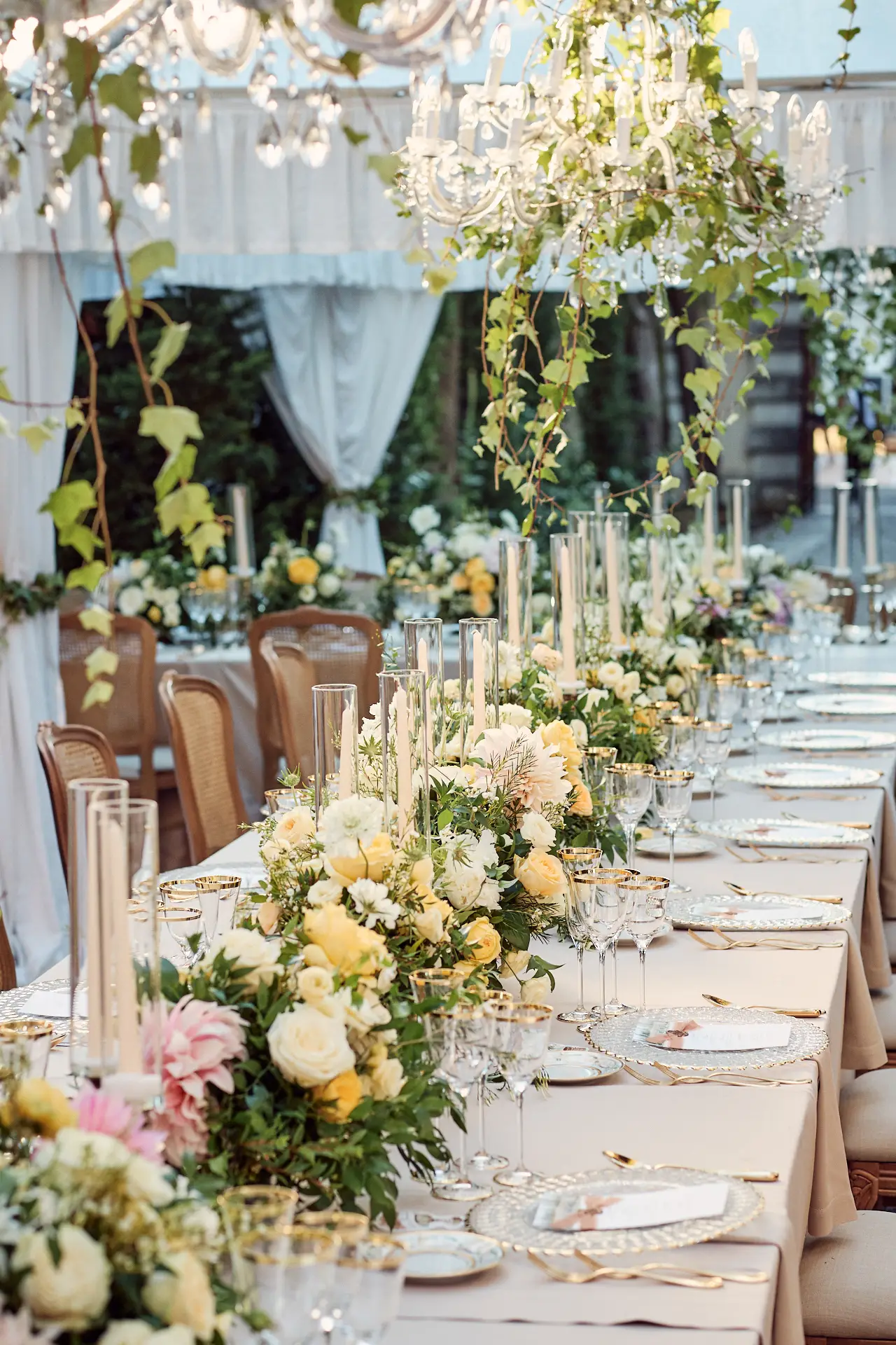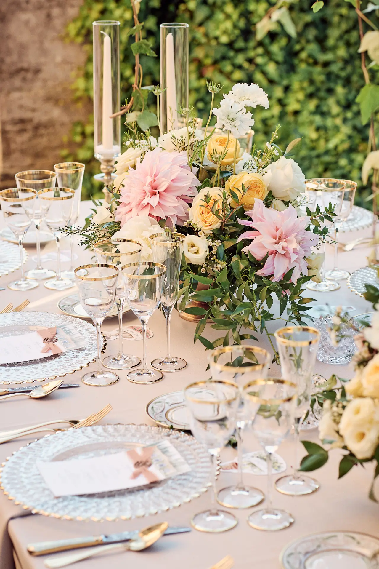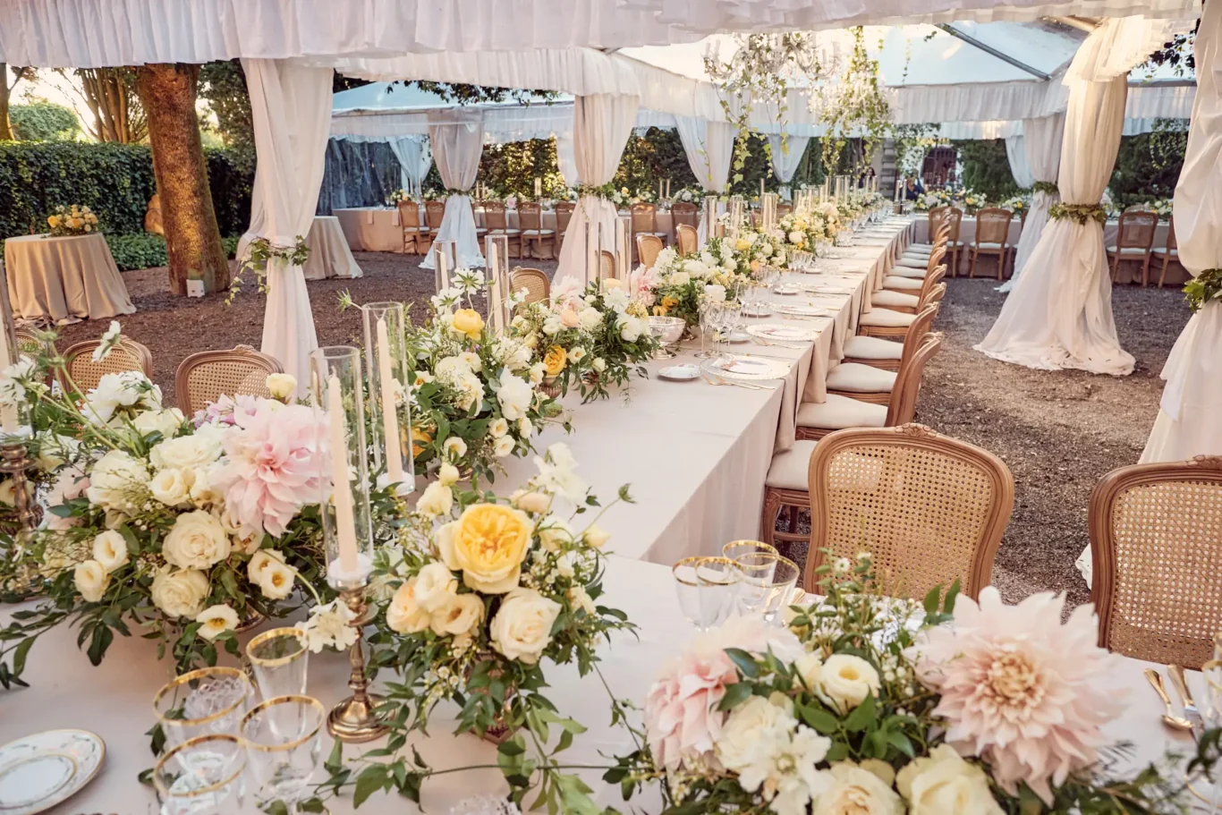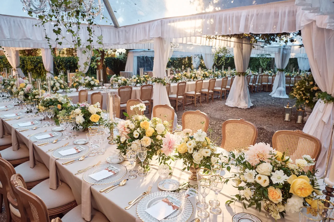 As the sun began its final descent, casting that iconic golden Tuscan light across the valley, we guided guests to a stunning al fresco dinner. A marquee, elegantly nestled between two ancient trees, provided a canopy for the evening. The design narrative was one of ‘sculptural romance.’ A palette of ivory, soft sage, and dusty rose complemented both the ancient stones of Pienza and the lush greenery of La Foce.