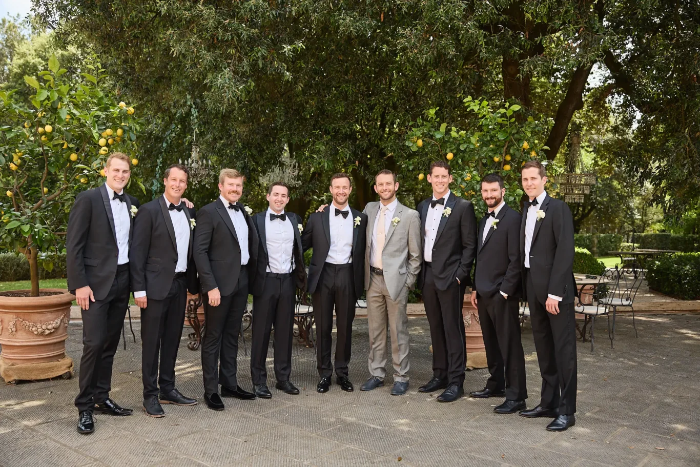 - A grand drone photograph capturing all the guests on the villa’s main steps.