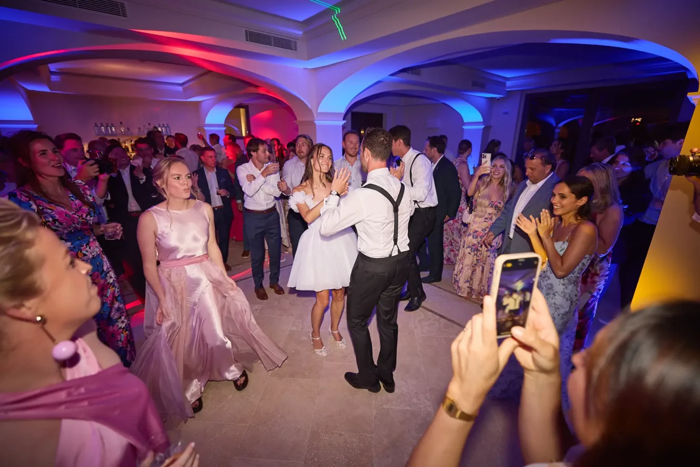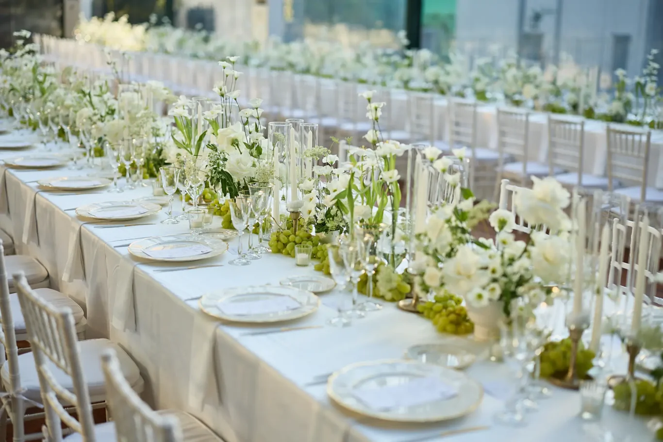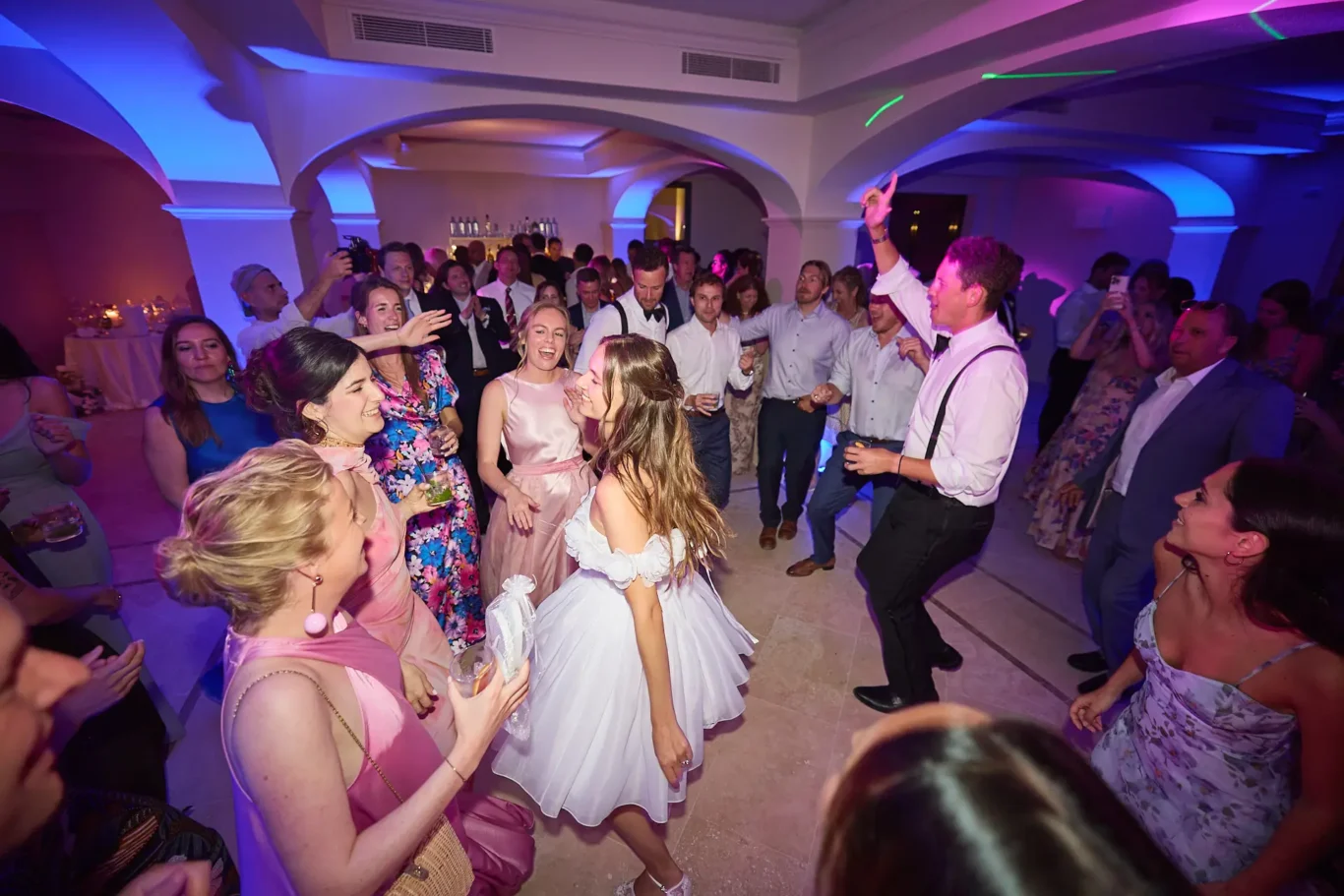 For dinner, guests entered the Grand Marquee, where two long imperial tables were set for a spectacular reception. The green and white theme continued in the floral arrangements and classic table settings, creating a scene of pure romance. After heartfelt speeches and a magnificent meal, we ushered everyone to the front of the villa for a surprise: a dazzling fireworks display that lit up the Umbrian night sky. This enchanting moment marked the transition to the party. Emma changed into a chic party dress, and together, we all headed downstairs to the villa’s dedicated disco, a hidden gem where the couple and their guests danced the night away.